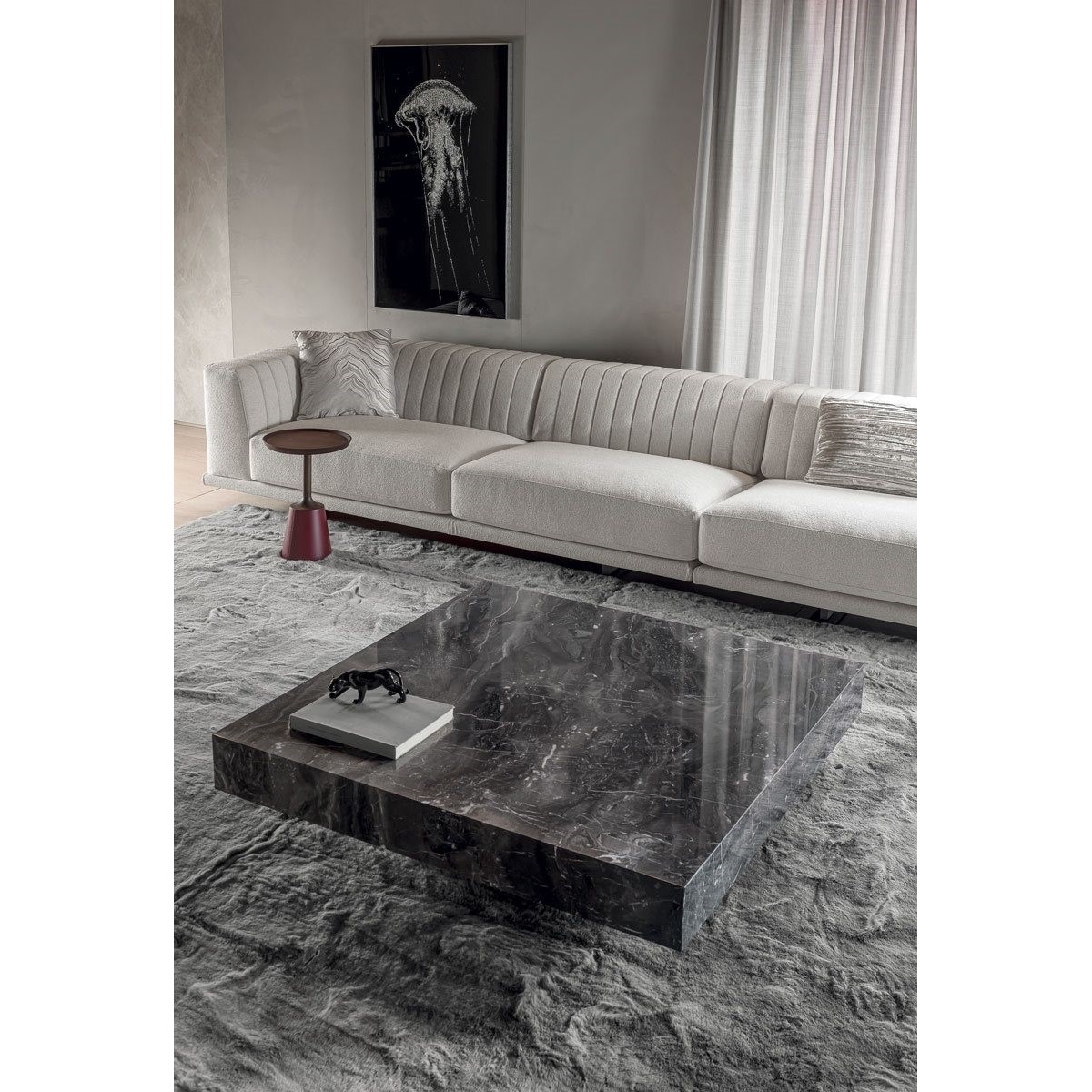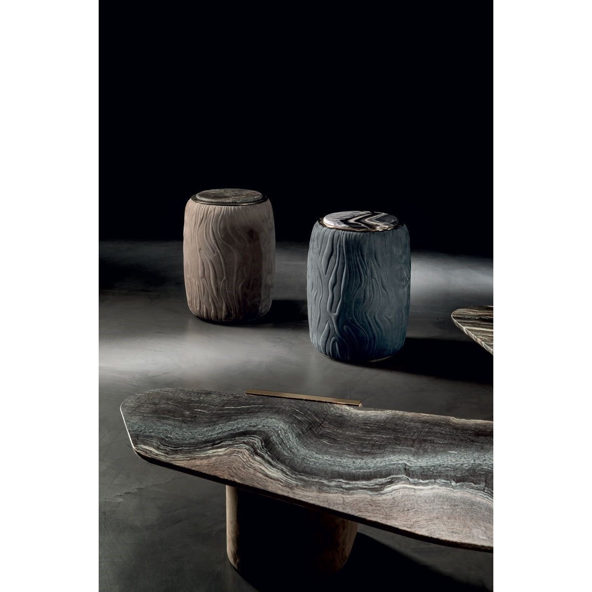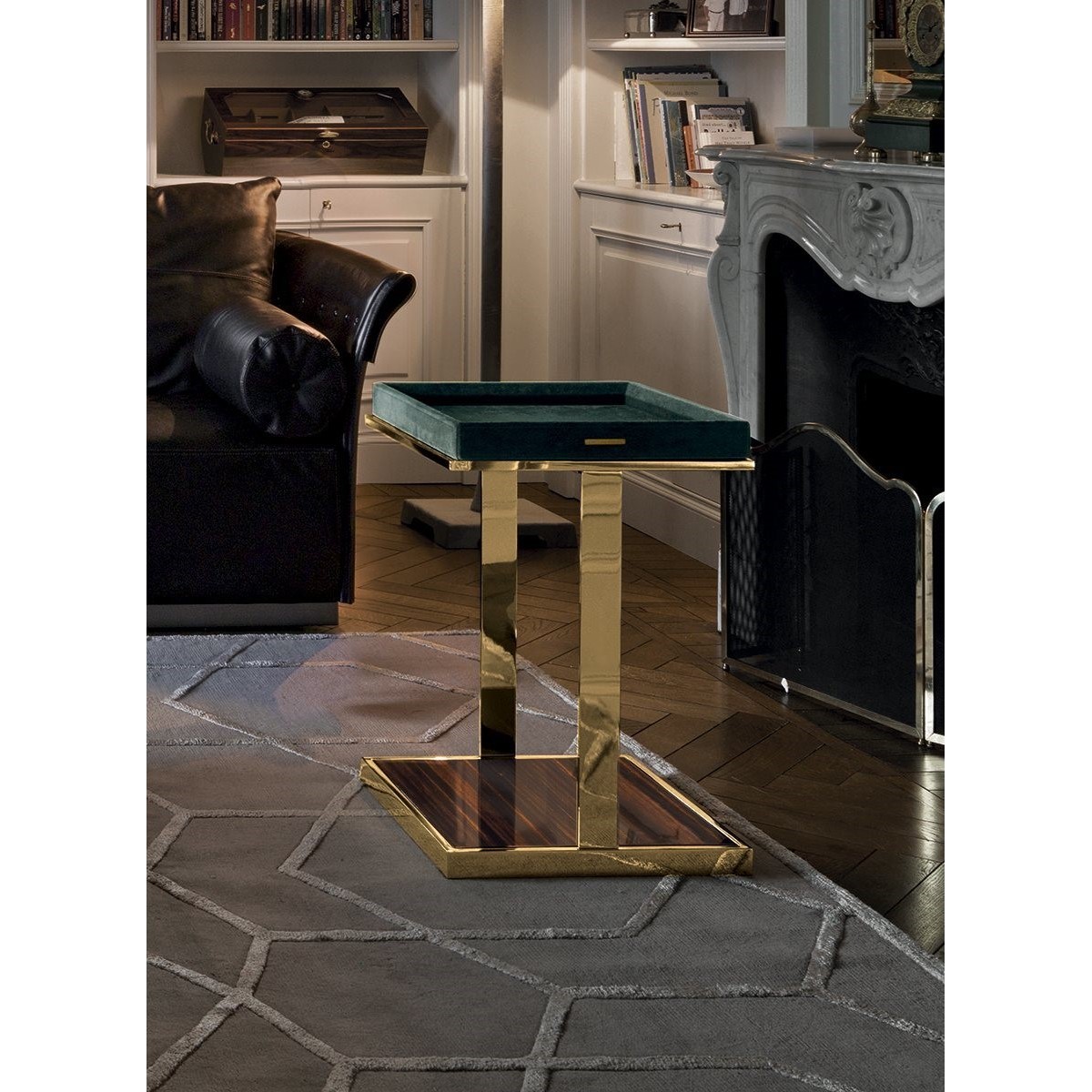 Metal base, available in: Satin nickel, bright shaded brown, Black Rose gold, bright light gold, matt Champagne gold, bright chrome, bright black chrome, matt satin bronze, bright pink gold, matt pink gold.two-tone finish, upon request. Top finish: Marble of 20 mm. thickness with 20 mm. bevelling in the colours: White Carrara marble, Imperial Brown marble, Sahara Noir marble (glossy and matt polyester finish), DoverWhite marble, Panda White marble, Guatemala Green marble, Corteccia marble, Port Saint Laurent marble,Red Levanto marble, Bardiglio Nuvolato marble, Elegant Brown marble, Shale Rosewood marble, Emperador Dark marble, Silver Wave marble, Agatha Black marble, Frappuccino marble, Calacatta marble, FusionLight marble, Patagonia marble, Explosion Blue marble, Fusion Multicolor marble, Juliet Quartz marble, Calcite Azul marble, Azul Macauba marble, Portoro marble. Bronze or smoky mirror 5 mm with bevelling. Upholstered in leathers from the catalogue.