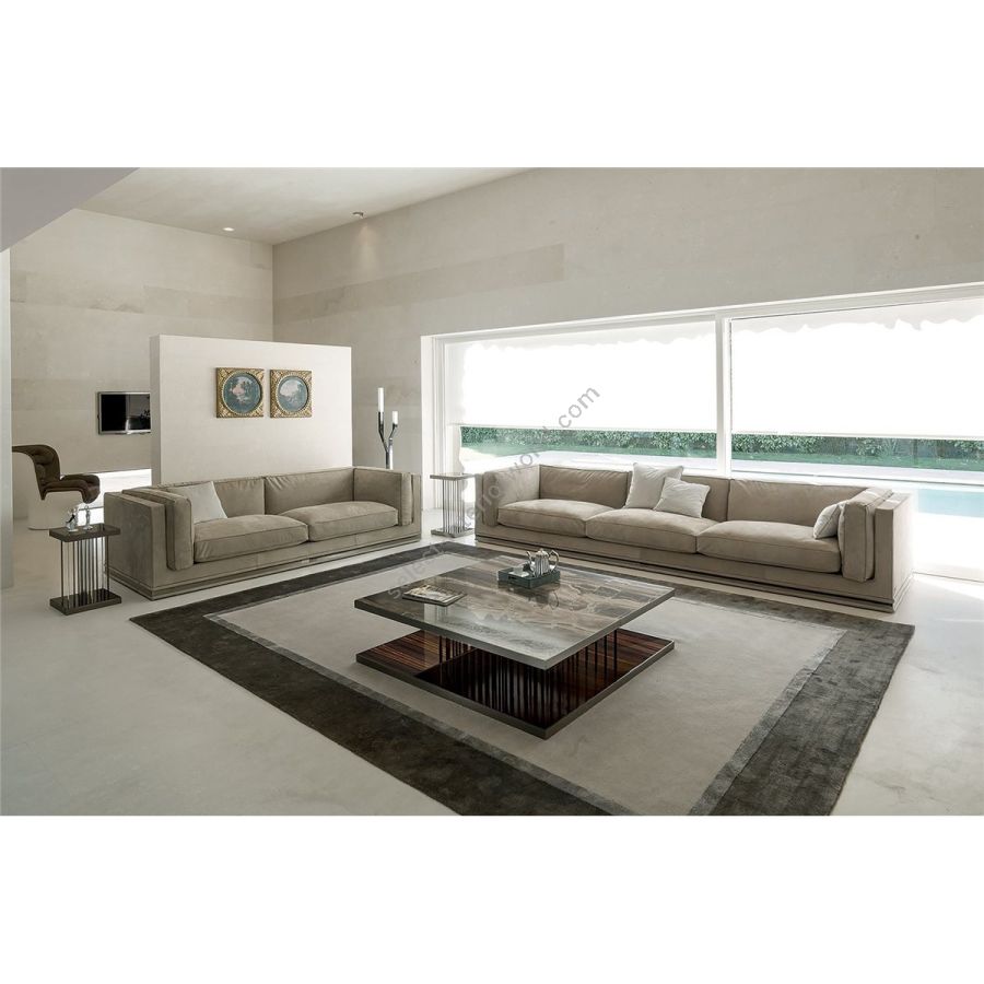 Frame in wood with elastic bands, covered in high density polyurethane foam. Backrest and armrest cushions are in sterilised goose down, with insert in medium-density polyurethane foam, and seat cushions are in triple-density polyurethane foam covered in sterilised goose down and supported with Memory Foam padding in order to maintain shape more effectively. Sofa available in two versions: fully padded without base or with chromed metal ring in the following finishes: Satin nickel, bright shaded brown, Black Rose gold, bright light gold, matt Champagne gold, bright chrome, bright black chrome, matt satin bronze, bright pink gold, matt pink gold. The open corner element, which can be used in compositions or as a chaise longue end unit - end unit with padded utility shelf, or utility shelf in marble or backlit dimmable onyx. Given the special manufacturing process, the structure upholstery is not removable, but the leather or fabric covers of all cushions are removable. The sofa comes in two depths: 105 and 95 cm.