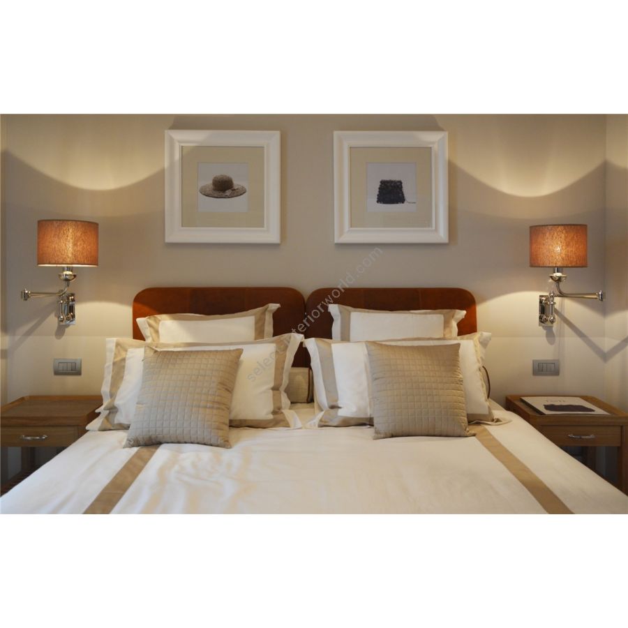 Sharp lines and an articulated structure describe this wall lamp in polished nickel finish brass, capable of adapting to any environment. Cylindrical lampshade in ivory fabric. Available in various finishes.