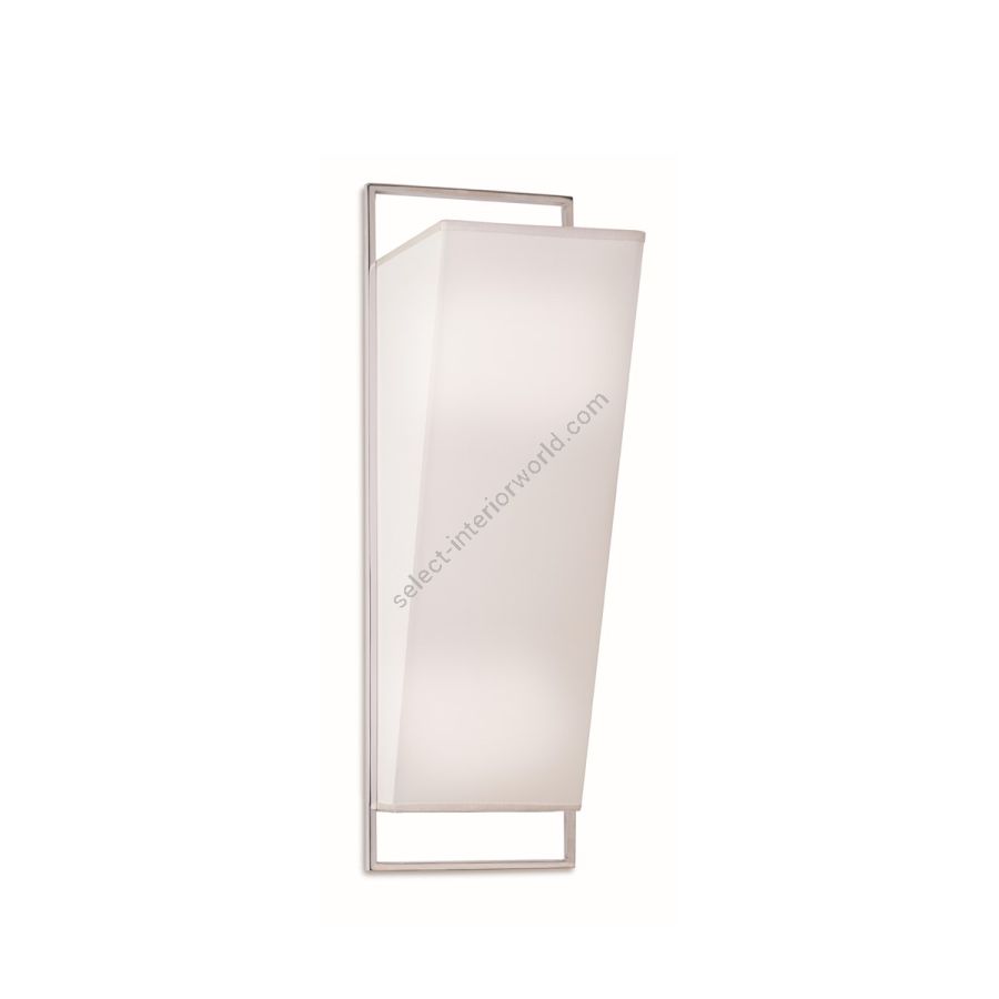Perfect match for bedrooms and common areas, the wall lamp model has a vertical structure in brass with a polished nickel finish, framing a shaped lampshade in white fabric. Available in various colors.