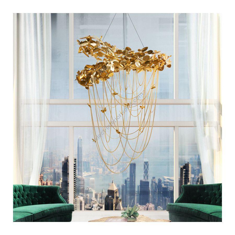 Made with gold plated hammered brass, handmade butterflies and majestic flowers ending with the touch of beautiful Swarovski crystals. Bold and feminine, this creation is a real lumen sculpture.