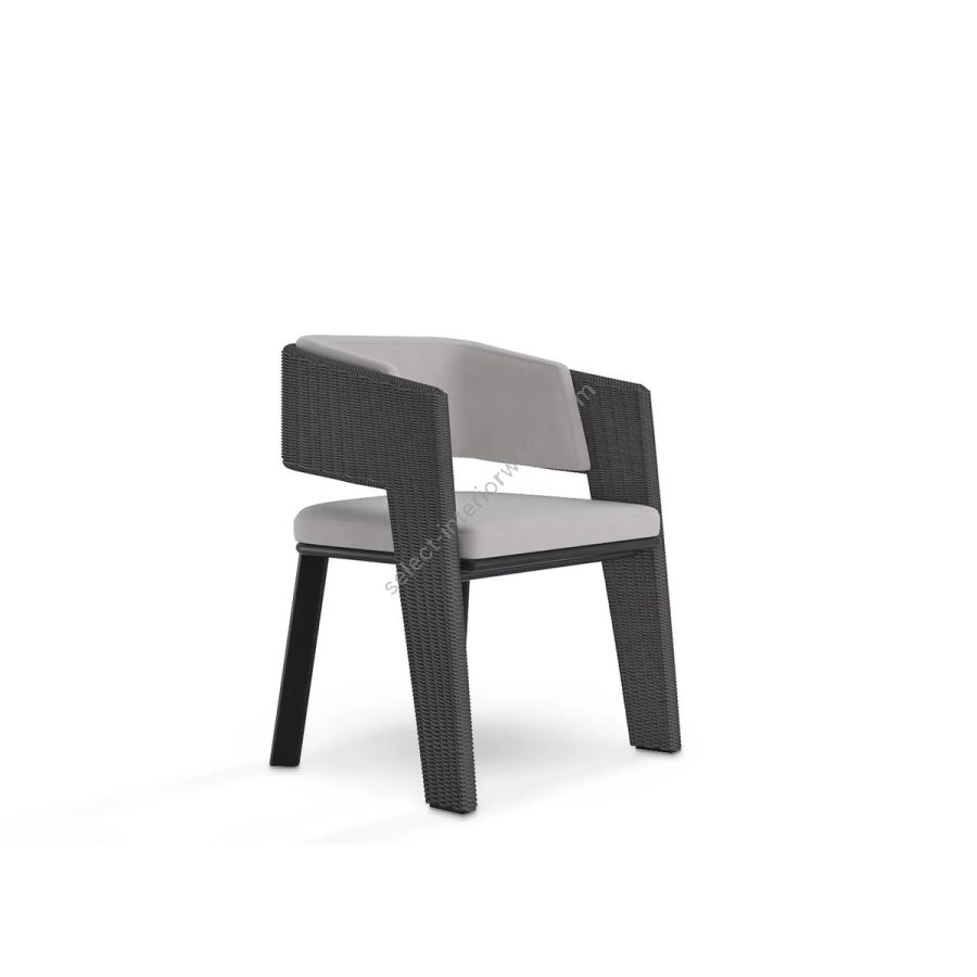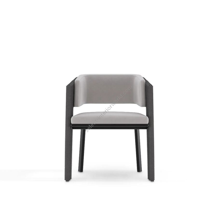 Galea is a glamorous outdoor dining chair that blends ancient with modern. It draws inspiration from an helmet worn by warriors in the Roman Empire and is brought to life through traditional weaving technics from Indonesia, combined with Portuguese exquisite Metal work for a durable and resistant outdoor piece. Made with Stainless Steel, Powder Coating & Synthetic Fiber this elegant chair with an Anthracite Rope Color is perfect for a relaxed yet luxurious outdoor.