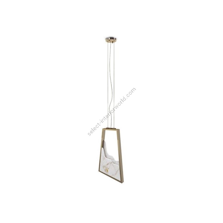 Magna presents a highly dimensional nature with a pendulum-like aesthetic and an elongated trapezium form. Inside its gleaming brass frame, the Magna Pendant Lamp has alabaster that evokes highlands and skylines, adding depth and a unique atmosphere to any space. This pendant’s natural textures offer depth and a sense of rarity to any project.