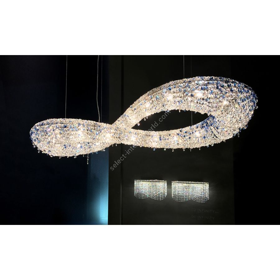The Infinity crystal chandelier awakens the power of eternity with its never-ending loops. This contemporary chandelier symbolizes empowerment and everlasting beauty. It offers a playful and dynamic illumination concept to any setting. The shape of this exclusive pendant lamp will bring an artistic touch to your interior design project.