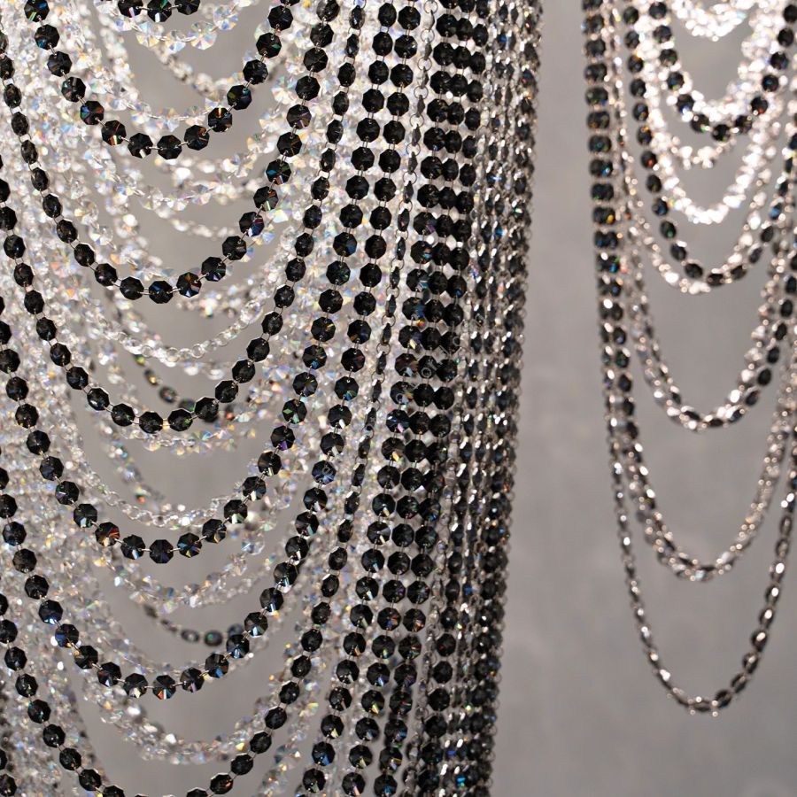 The speciality of crystal use is the play of light and shadow and the bold use of colour, showing a different face from every angle. An important design element of the chandelier is its lacing technique, which uses the interplay of colourful crystal chains as shining necklaces to create a luxury piece of space jewellery. A true jewel of the space, using contrasting colours and lines, enhanced by the creative use of materials. Mirage is not only a fusion of colours, but also of generations. The designers of the colourful crystal chandelier are János Héder and his son Máté Héder, a young and talented jewellery designer.