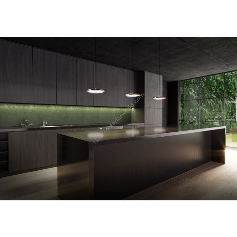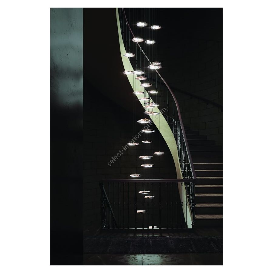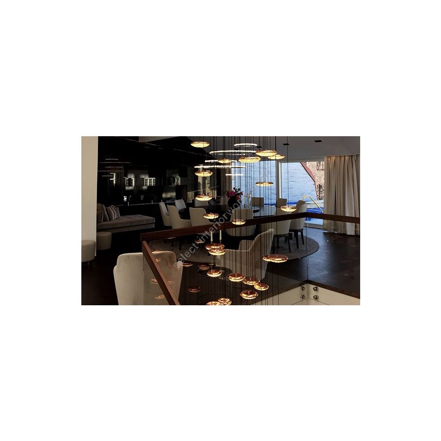 The name Origo means “origin” and alludes to the infinite light at the birth of the universe, bringing a sense of cosmic depth to its perfectly circular form. A fusion of luxury and minimalist aesthetics, the Origo crystal chandelier embodies the essence of modern elegance. This handmade crystal chandelier is crafted from premium-quality crystal and offered in a variety of finishes. It can be flexibly integrated into complex, high-end interiors, with bespoke options available for tailored design concepts. Its adaptable structure allows for both horizontal and vertical compositions. Horizontal arrangements work beautifully above kitchen counters, dining tables, or workspaces, while vertical installations are ideal for staircases or atriums with high ceilings. Whether displayed as a single statement crystal lamp or arranged in groupings, the Origo crystal chandelier adds a sophisticated visual presence to a wide range of architectural settings. Recommended to be installed in clusters of varied sizes.