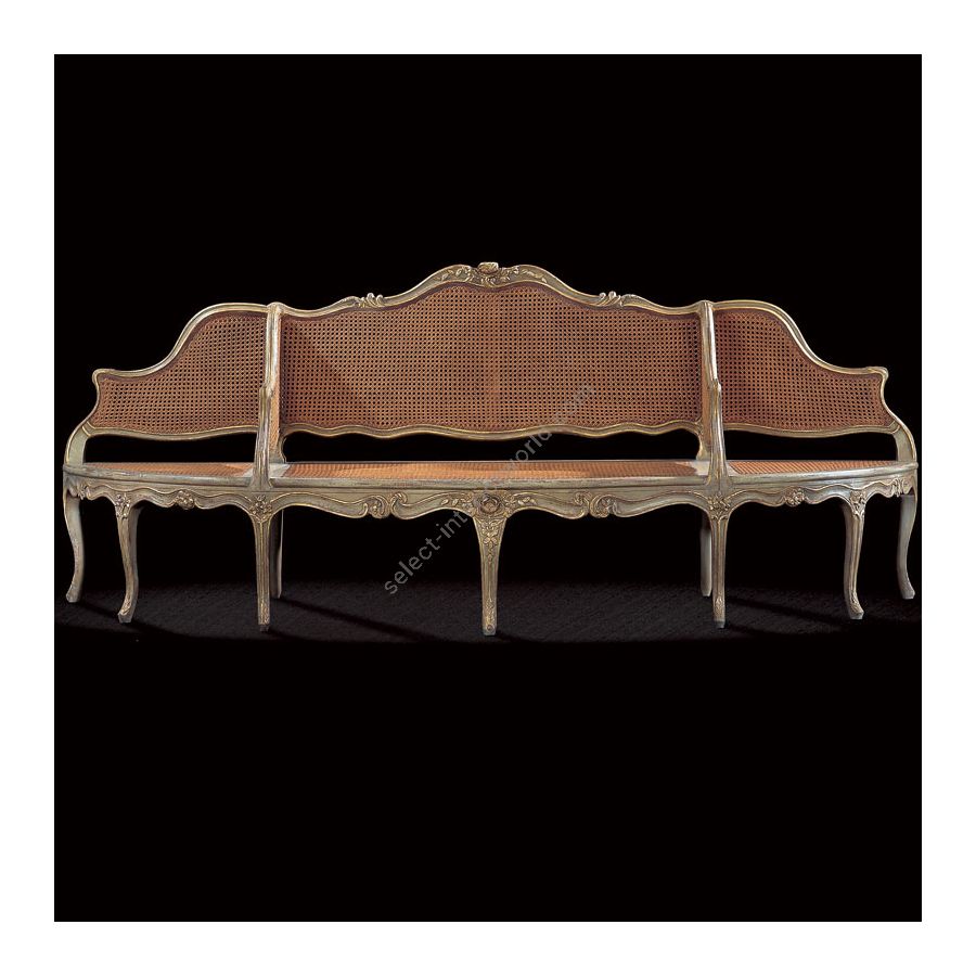 This large, deep cane sofa with eight legs represents all the brilliance of the great cabinet makers of the middle of the 18th century in France. It is a large, movable seat, curving and counter-curving, with deep floral motif carvings. The “beading” finished in foliage that separates the moulding in the middle of the legs denotes superior quality. The pronounced “ridged razor-back” will also be noted, the rounded fastenings of the belts to the legs, which connect this piece of furniture to that produced by the great cabinet makers of Lyons (Pierre Nogaret, François Canot, Thomas Levet…). This style can also be seen with René Cresson and Nicolas Heurtaut.