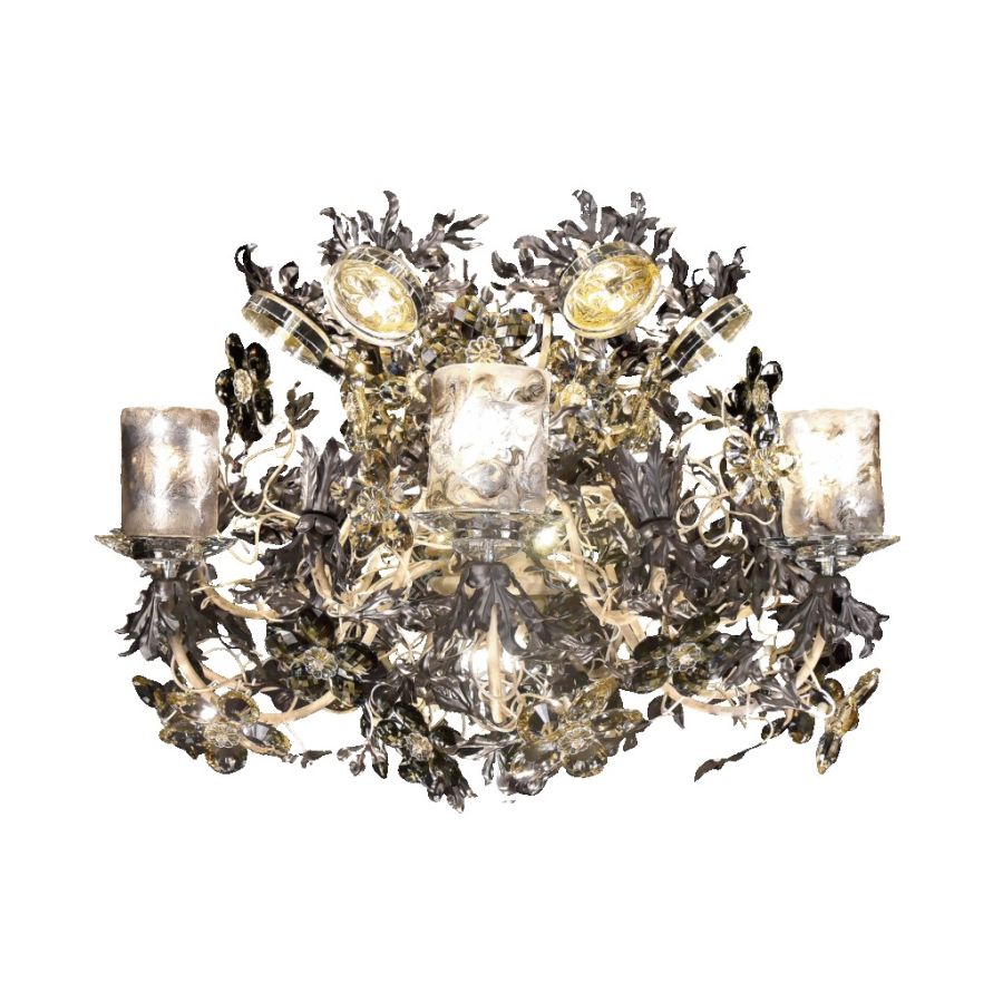 chandelier in wrought iron with clear and coloured Bohemian crystal