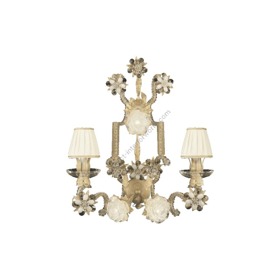 2 lights + 3 led wall lamp in wrought iron with clear Bohemian crystal, Murano glass, Bohemian strip and silk lamp shade