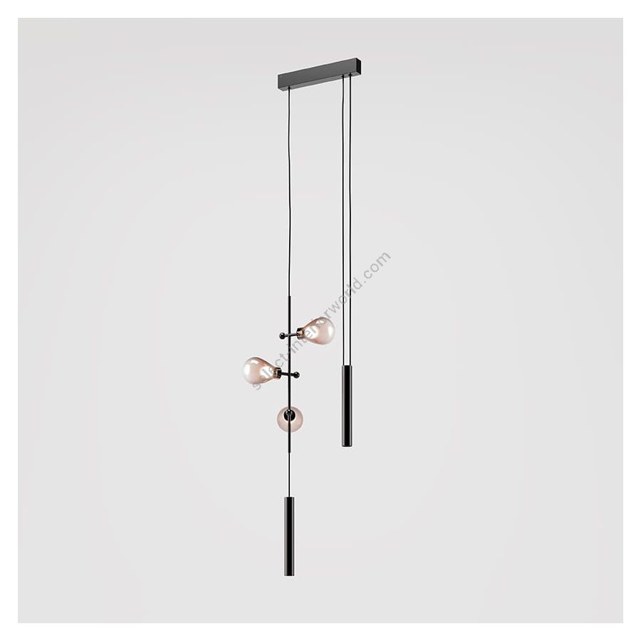 Inspired by the glorious lamps of Art Deca, it adopts the stylistic features with a contemporary reinterpretation. The key element of the project is the electric cable, an essential part of the aesthetic language of the project. An adjustable element that allows you to vary the graphic lines and formal appearance. Structure in painted metal in carbon black, globes in pink smoked glass.