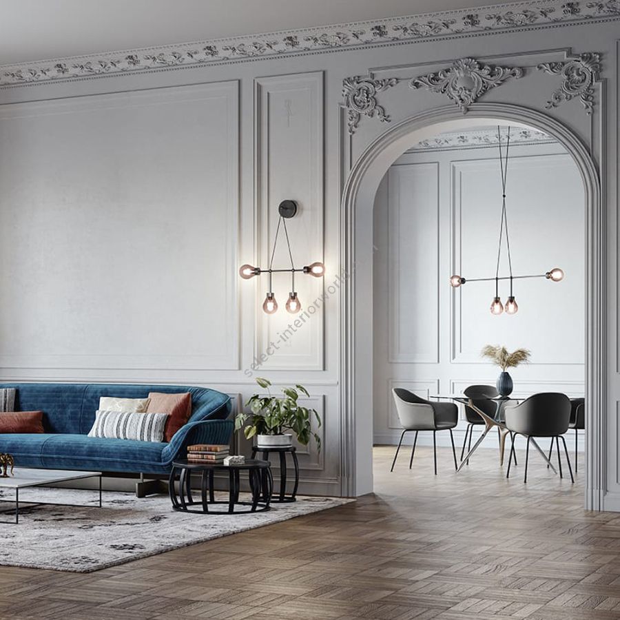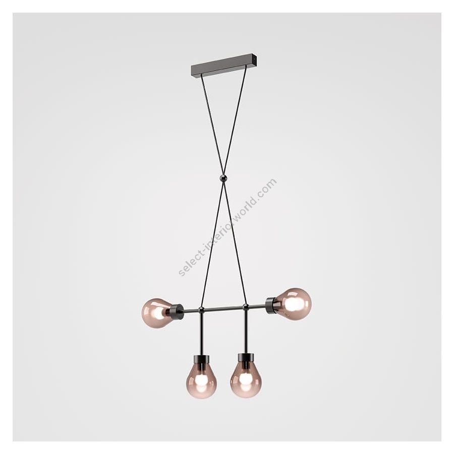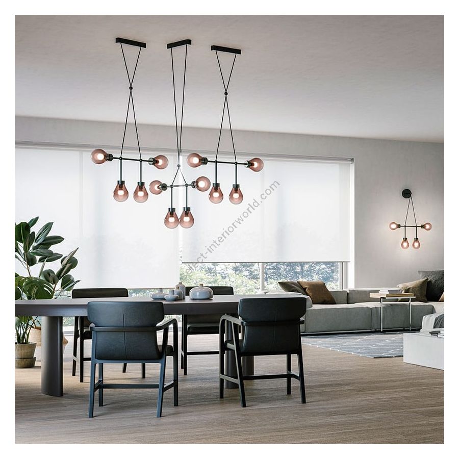 Inspired by the glorious lamps of Art Deca, it adopts the stylistic features with a contemporary reinterpretation. The key element of the project is the electric cable, an essential part of the aesthetic language of the project. An adjustable element that allows you to vary the graphic lines and formal appearance. Structure in painted metal in carbon black, globes in pink smoked glass.