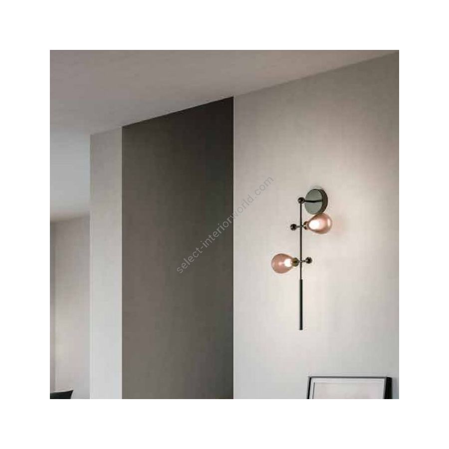 Inspired by the glorious lamps of Art Deca, it adopts the stylistic features with a contemporary reinterpretation. The key element of the project is the electric cable, an essential part of the aesthetic language of the project. An adjustable element that allows you to vary the graphic lines and formal appearance. Structure in painted metal in carbon black, globes in pink smoked glass.