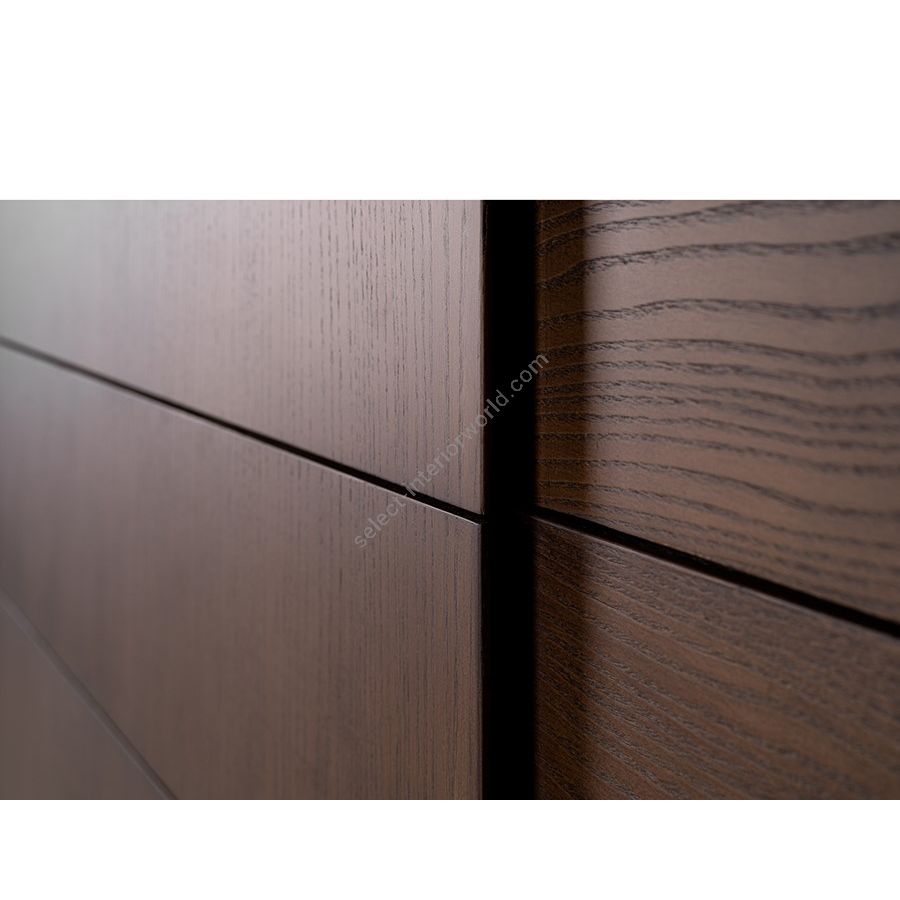 The natural wood grain decorates the Anerio chest of drawers and bedside table; the contrast in the wood grain is exalted by the peculiar shape of the front panels of the drawers.