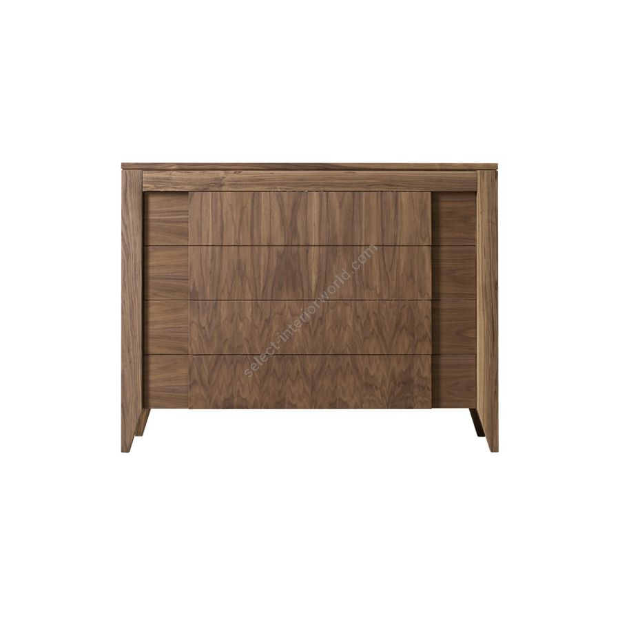 Chest of drawers made of canaletto walnut wood with 4 drawers and 1 hidden drawer under the top. Drawer fronts with opposed grain and different reliefs. The natural wood grain decorates the Anerio chest of drawers and bedside table; the contrast in the wood grain is exalted by the peculiar shape of the front panels of the drawers.