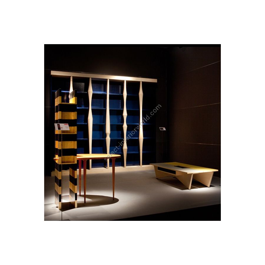 Open storage cabinet with cherry wood frame, blue lacquered. Base, top and front columns in maple wood.. MEASURES: L 300 W 40 H 270 WEIGHT: 250 kg M3: 2 PIECES: 17 Production time: 60 days. Shipping included in the price.