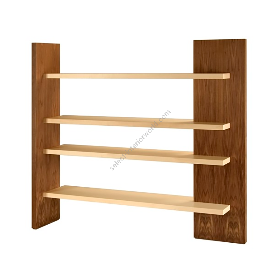 Freestanding bookcase with 2 double face vertical elements and 4 shelves in walnut and maple, thickness of 4.5 cm.