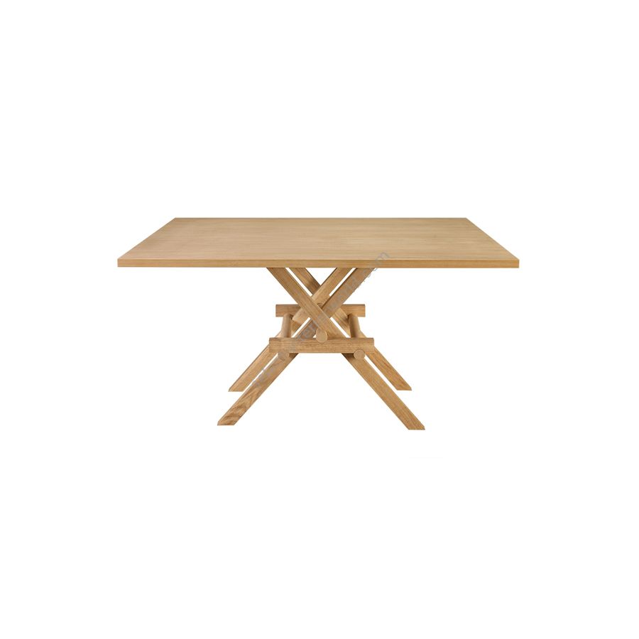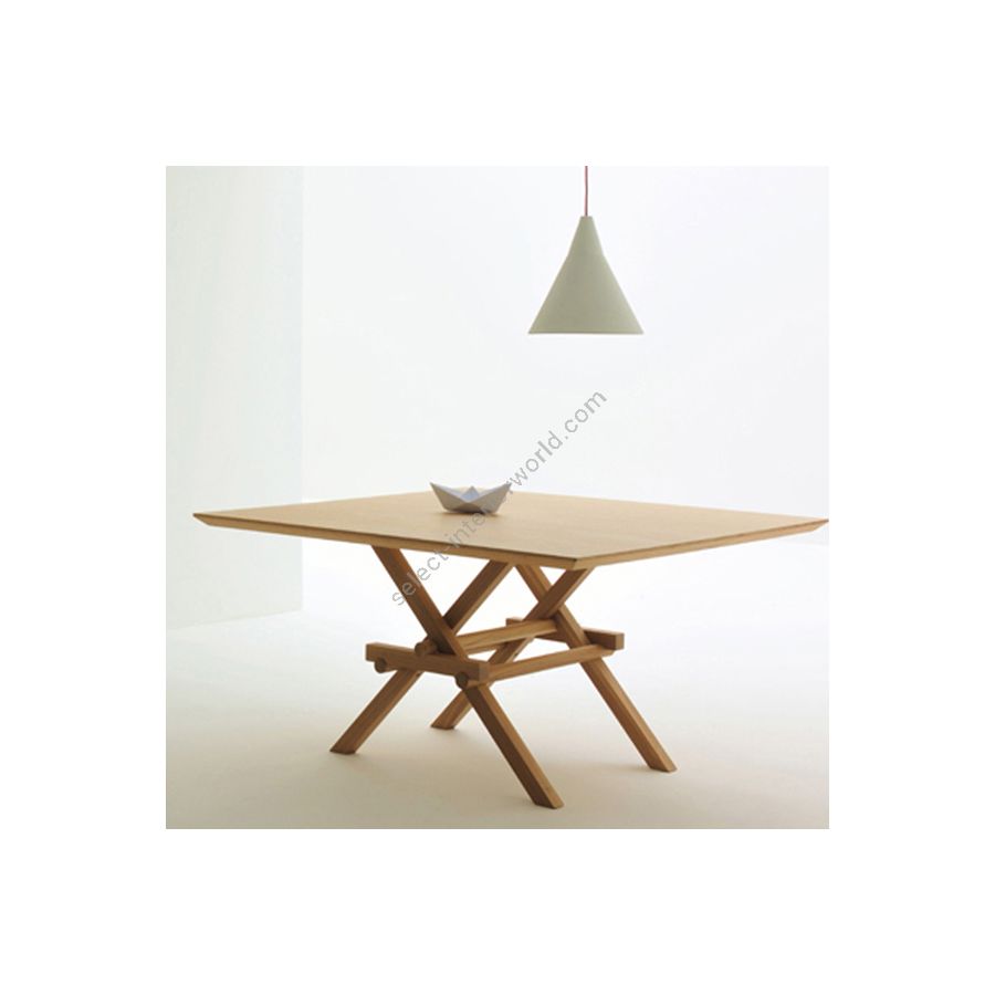 Table made of solid ash wood. The joint of the legs, without any screws or metal joints, is inspired by the construction of mavable bridges of Leonardo da Vinci. Inspired by Leonardo Da Vinci’s the mobile bridges, Marco Ferreri has created Leonardo: a unique square table. The central leg, made of solid ash wood, makes it unique thanks to the skillful combination of joints, which support the precious top. Available in different models with glass top or made of ash wood, Leonardo is a perfect example of applied cabinet-architecture.