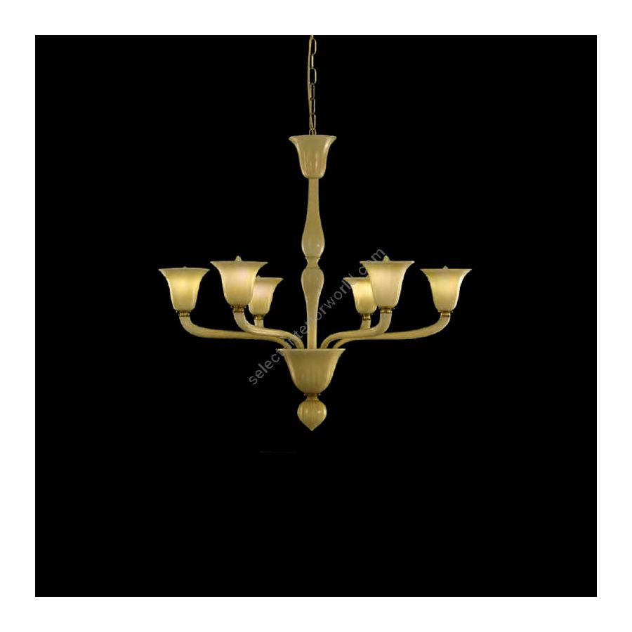 The design harks back to the Murano glass chandeliers typical of the Roaring Twenties. The classic glass chandeliers Bevante are characterized by basic and essential elements, such as the straight central arm. The "rigadin" texture (blown glass with straight ribs) creates beautiful reflections and contrast effects on the glass, the cups which cover the bulb is tapered.
