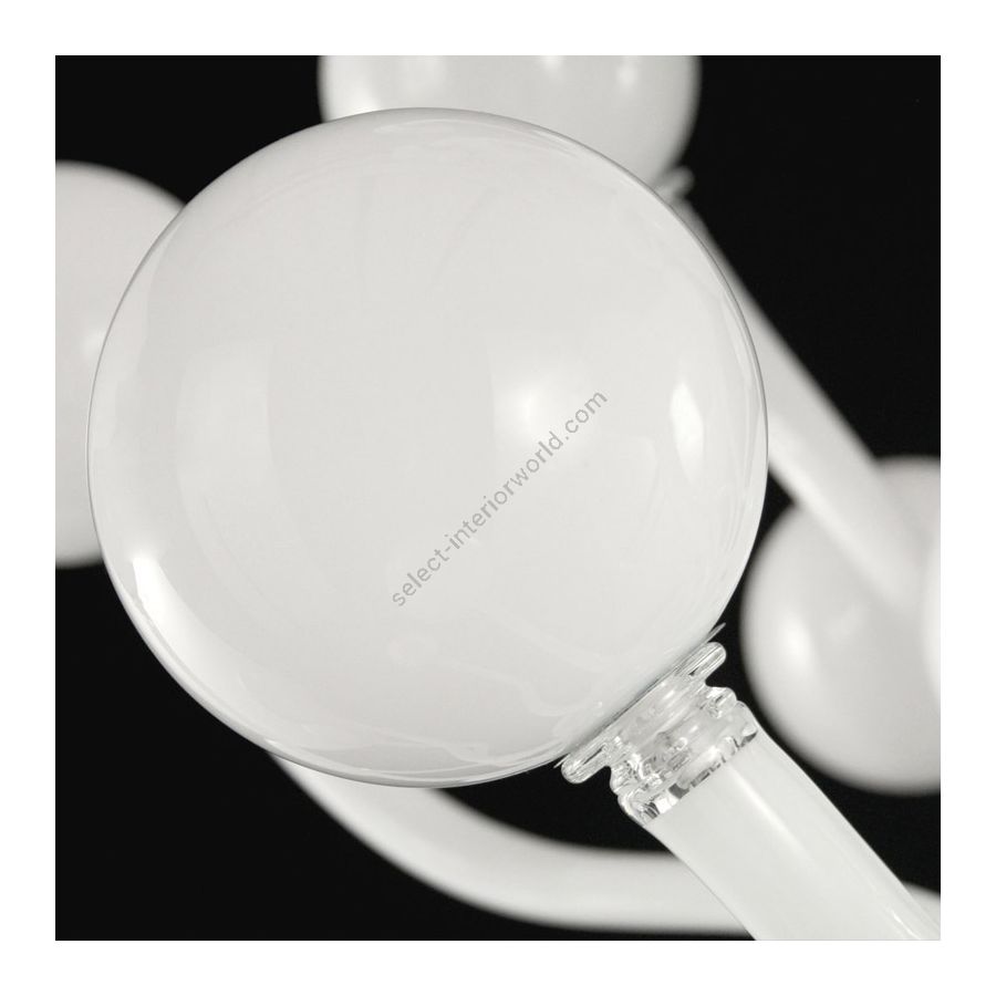 The central column has been transformed in a wavy element. From the two bottom bowls depart two tiers of arms of different forms and lengths, which are placed around the central column in an irregular way. At the end of every arm, the light source has been enclosed in a sphere of hand-blown glass, so it is completely hidden inside the glass structure.