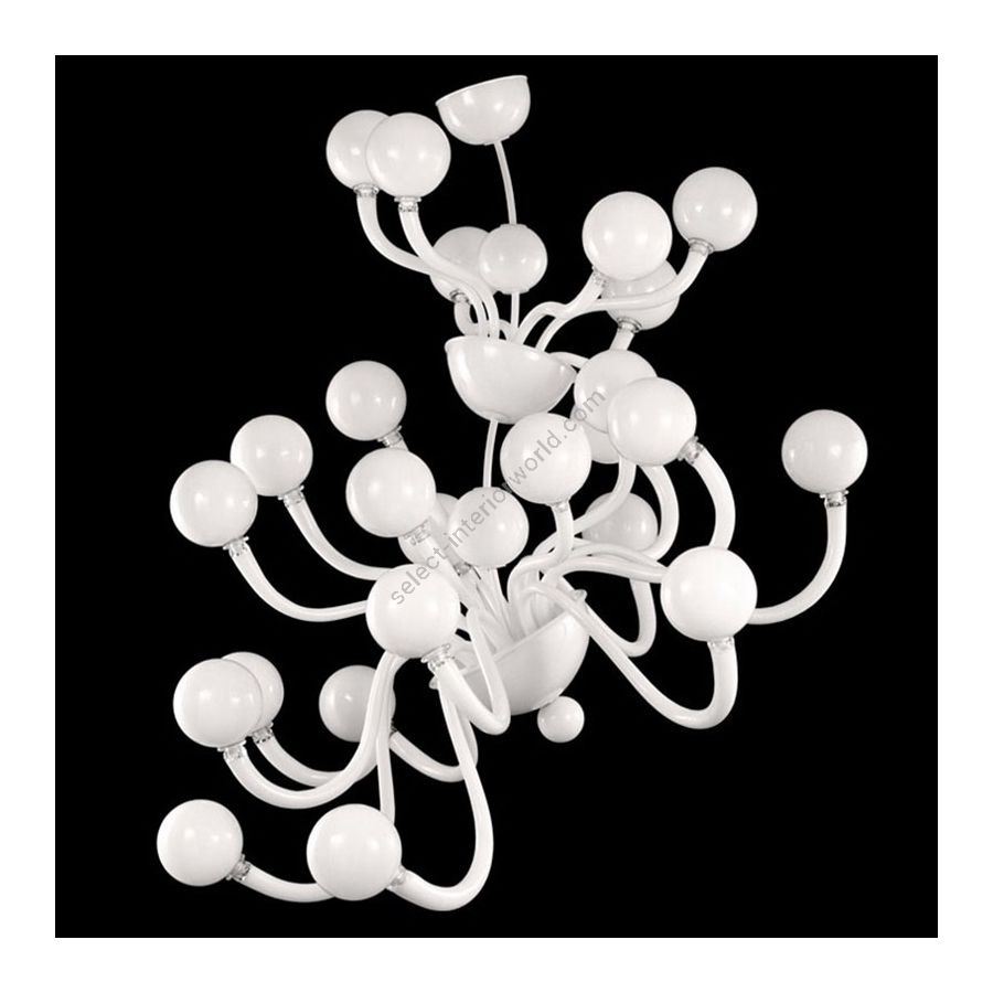 Dadaumpa is suggested in the catalogue in a milky white colour tone, but it can be customized choosing from a vast range of colours, both transparent and opaque. This chandelier in artistic glass gives its best if inserted in wide environments, that better enhance its magnificent structure with a great number of lights.