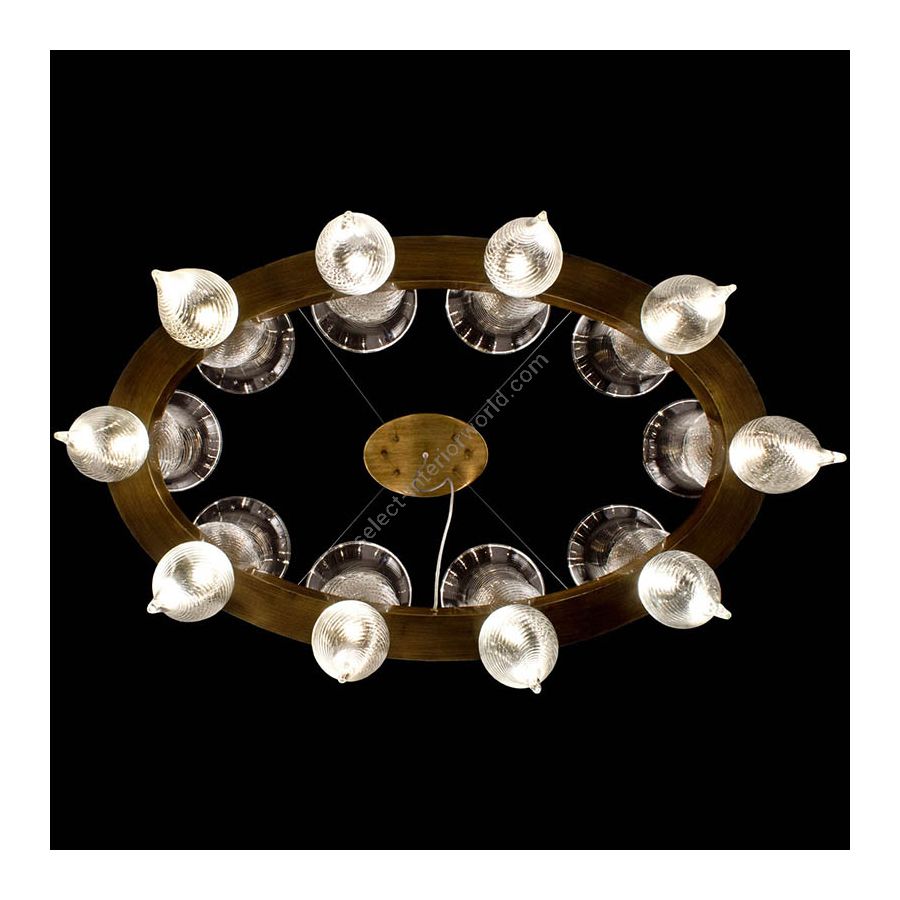 The blown glass chandeliers collection Heritage is embellished with large glass elements decorated with the “rigamenà” technique. This texture amplifies the glares on the glass surface and creates a beautiful contrast with the polish metal surface of the oval.