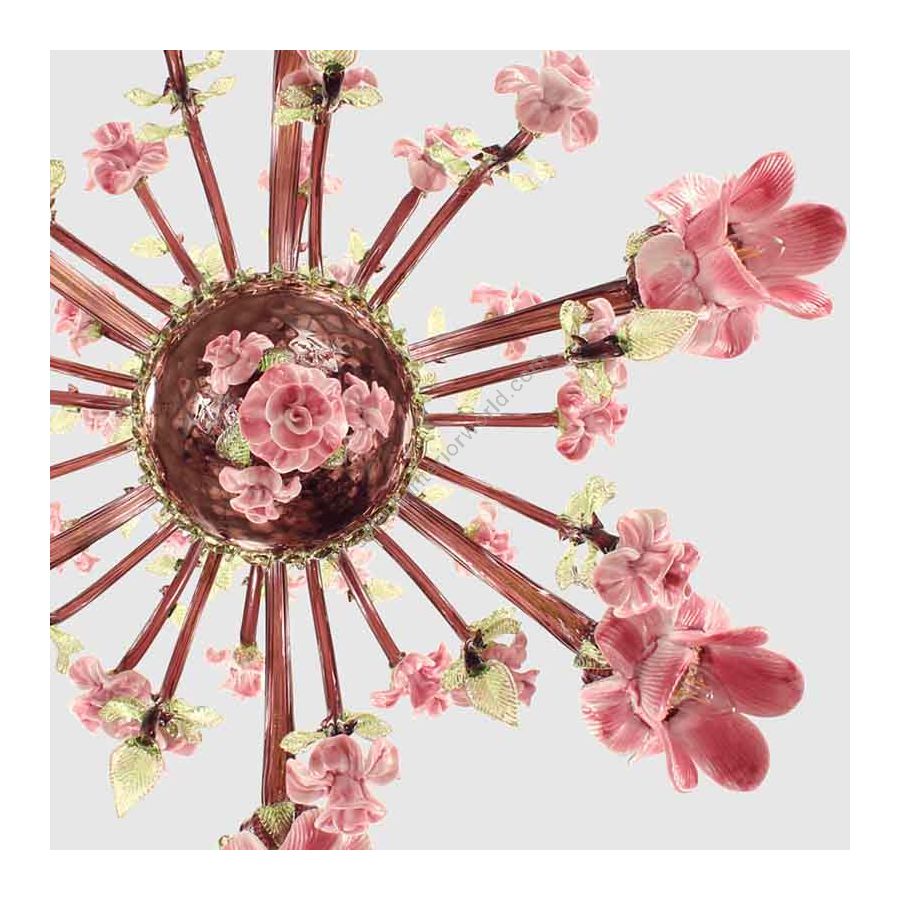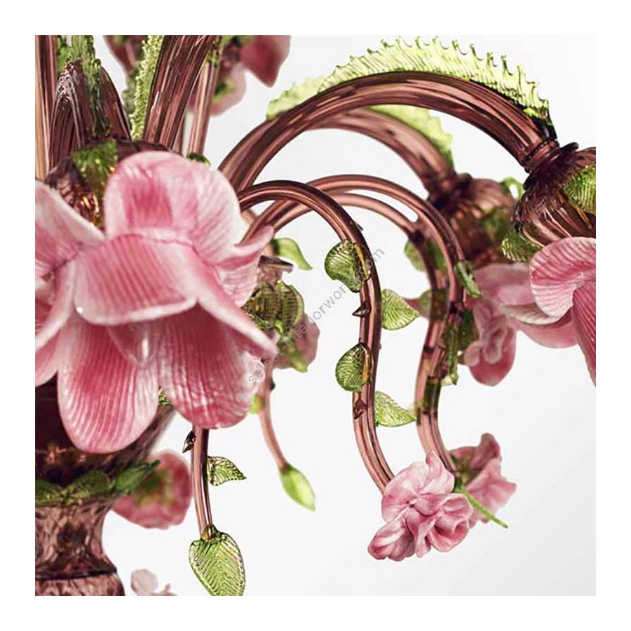 Rosae Rosarum classic chandelier is composed by a multitude of roses made of polychrome glass in pink tones. All the elements in this chandelier pay homage to the rose: not only the decorations, which have been attached at the end of the stems, but also the cups have a rose-like shape.