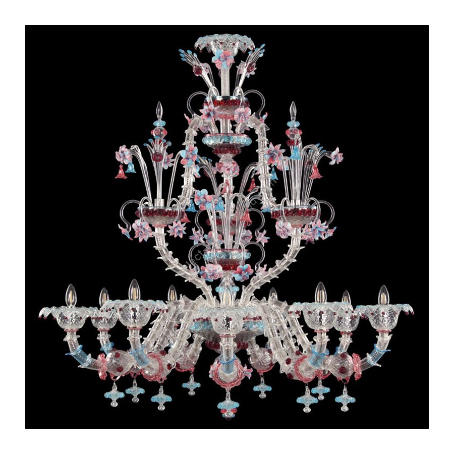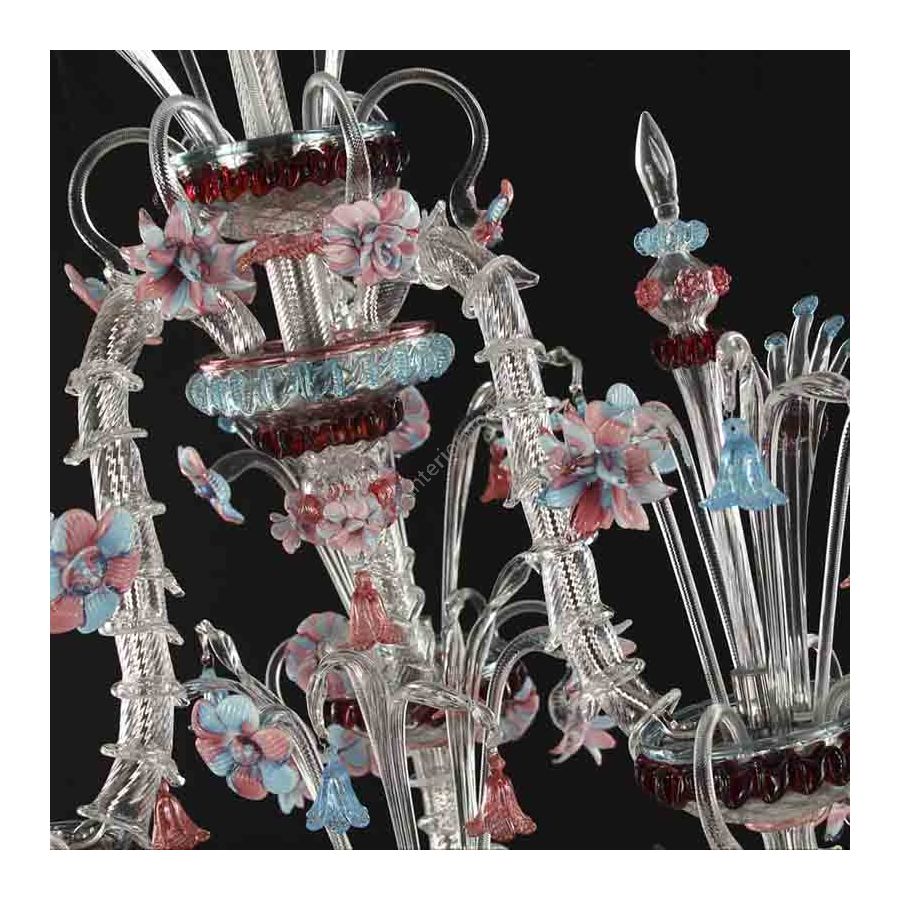The Ca’ Rezzonico chandelier is a collection inspired from the splendour of the noble italian families and of their dwellings. This blown glass chandelier is a large Ca’ Rezzonico model, embellished with unusual and delicate decorations, such as the flowers “a manina” and the leaves, which have been attached to the structure.