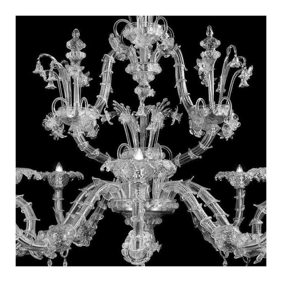 The Ca’ Rezzonico chandelier is a collection inspired from the splendour of the noble italian families and of their dwellings. This blown glass chandelier is a large Ca’ Rezzonico model, embellished with unusual and delicate decorations, such as the flowers “a manina” and the leaves, which have been attached to the structure.