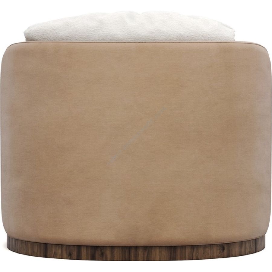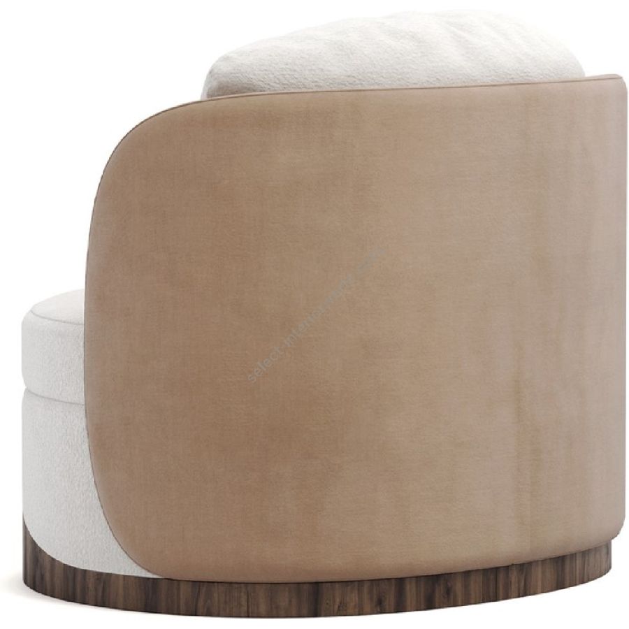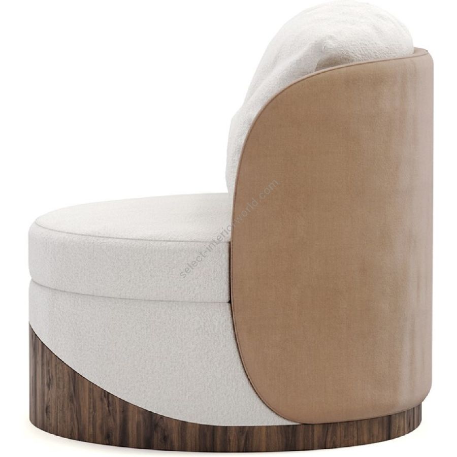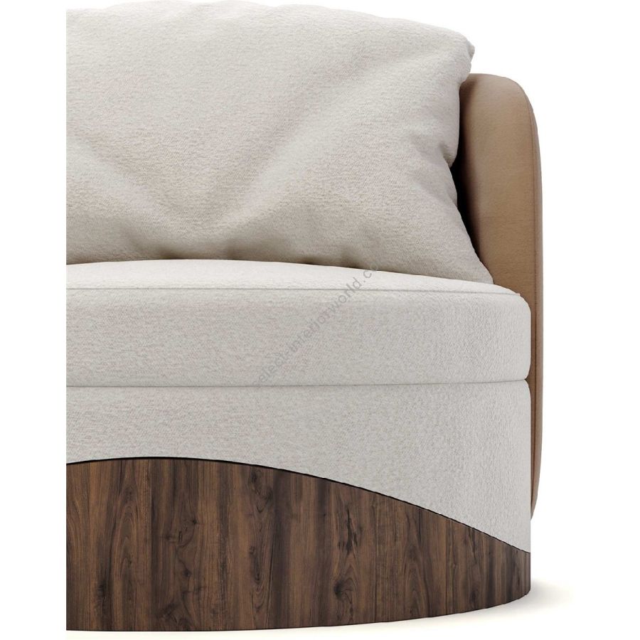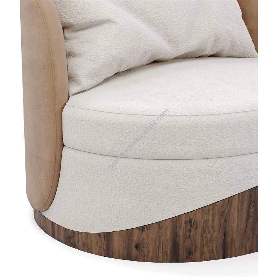 The Balli Armchair features a sumptuous cream fabric that envelops its soft, round seat, inviting you to relax in its embrace. The chair’s back and sides are covered in a warm beige fabric, adding depth and a touch of elegance to its modern silhouette. The distinctive base is crafted from rich walnut wood, with a wavy design that echoes the chair’s curves and adds a natural element to its aesthetic.