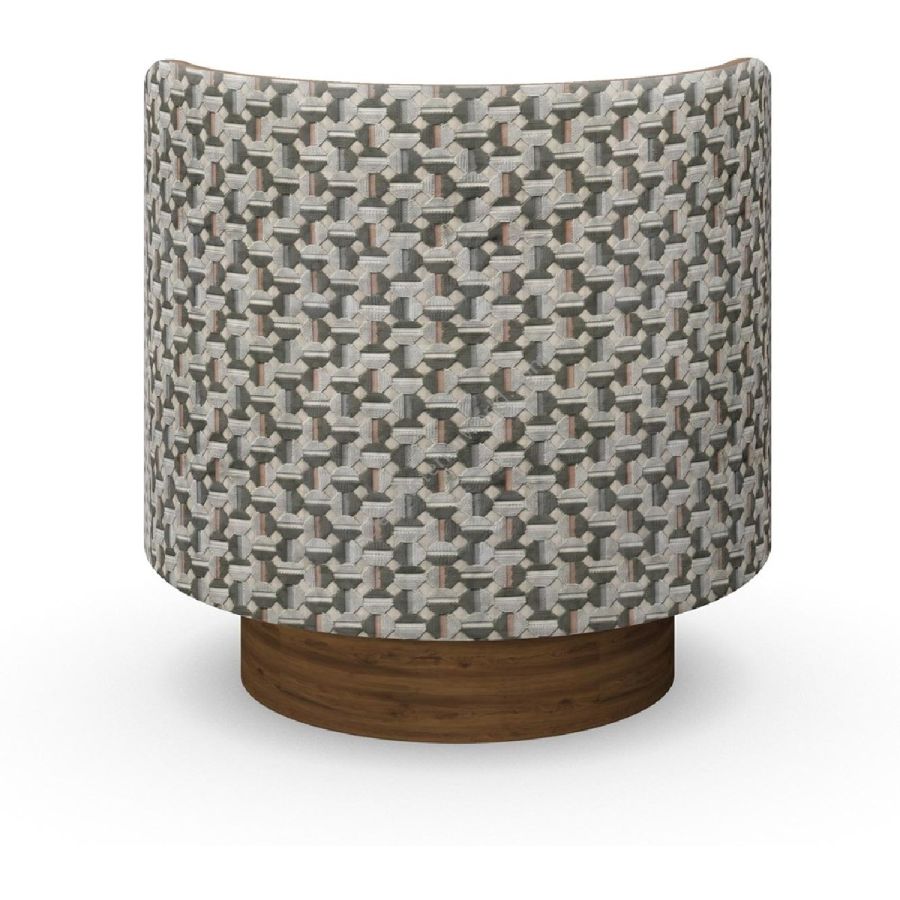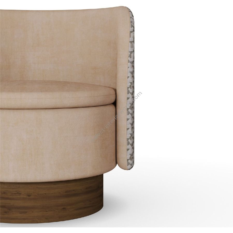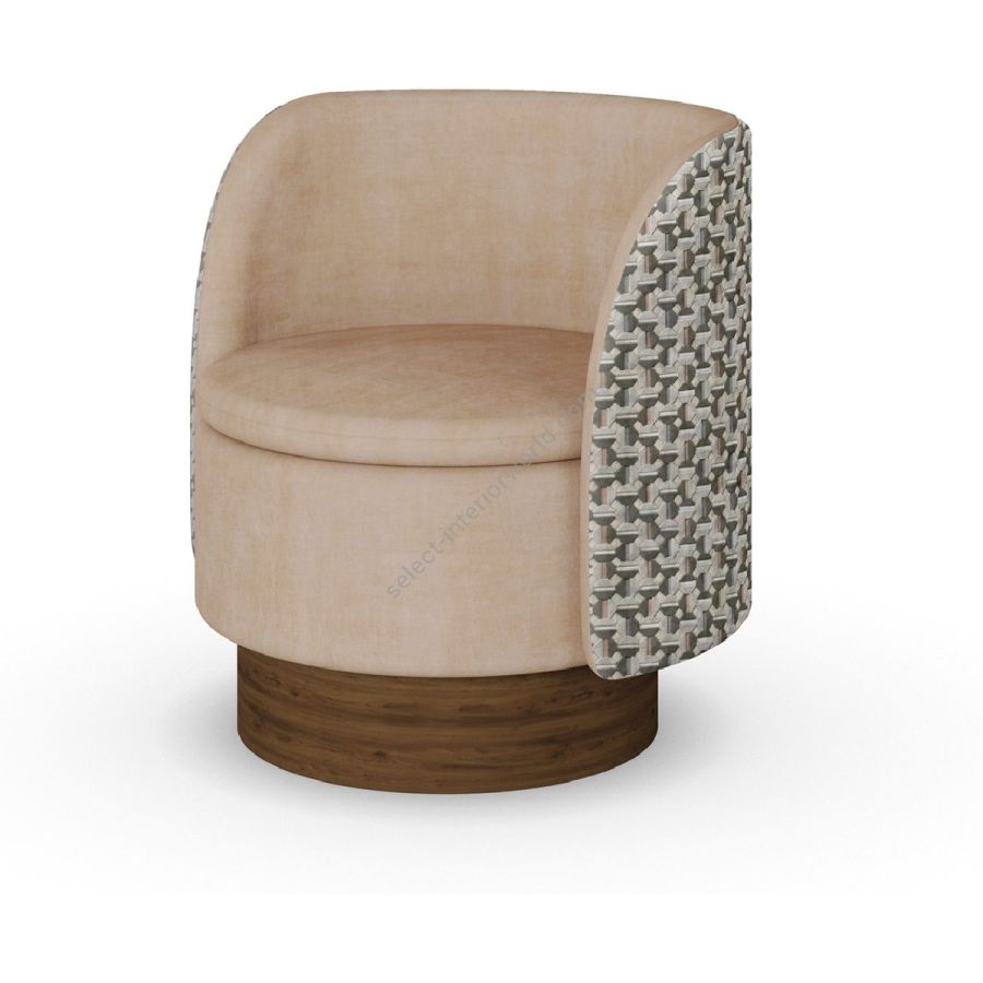 The Carrie Armchair features a plush seat upholstered in a soft, beige fabric that offers a warm and inviting feel. The back and sides of the chair are adorned with a distinctive patterned fabric, creating a unique visual contrast and adding texture to its sleek silhouette. The chair is supported by a robust walnut base that adds a natural element and ensures durability.