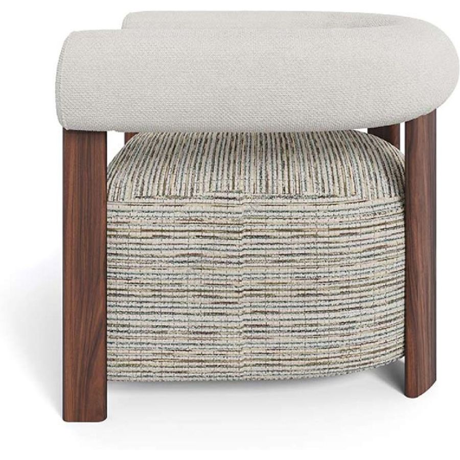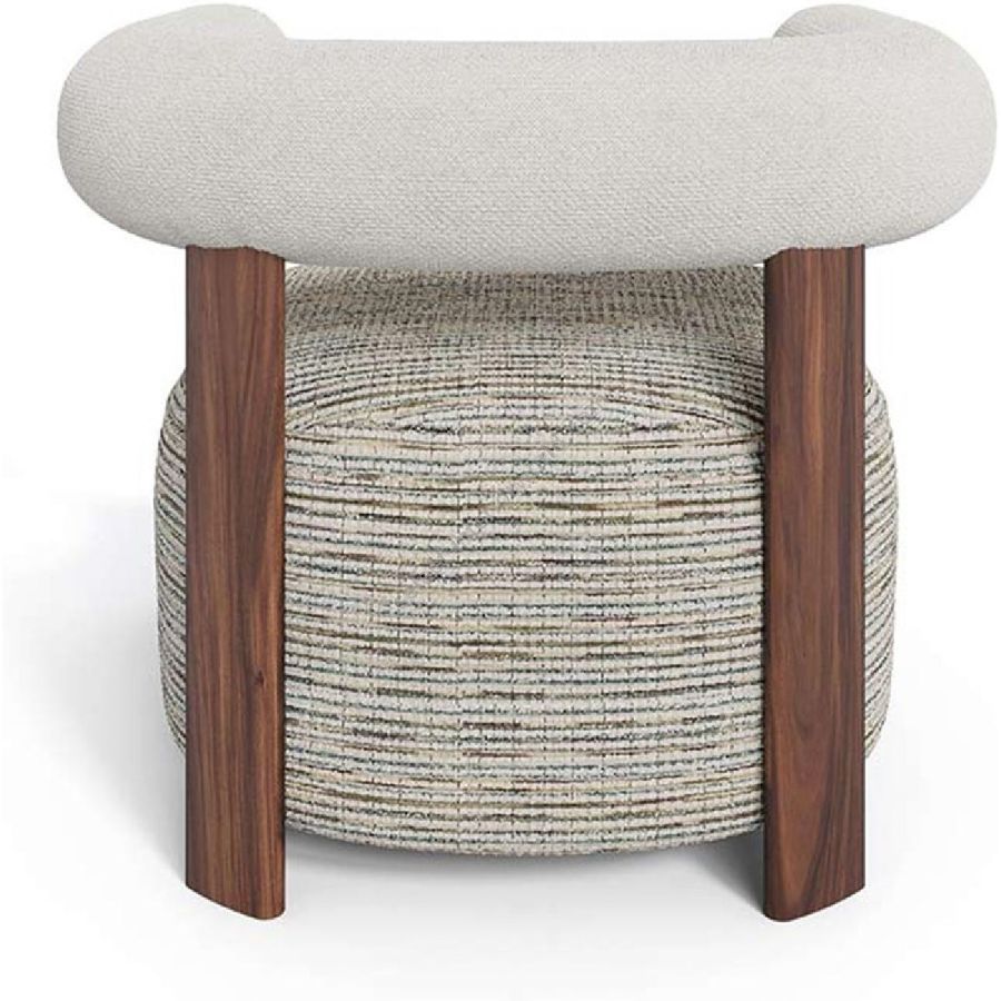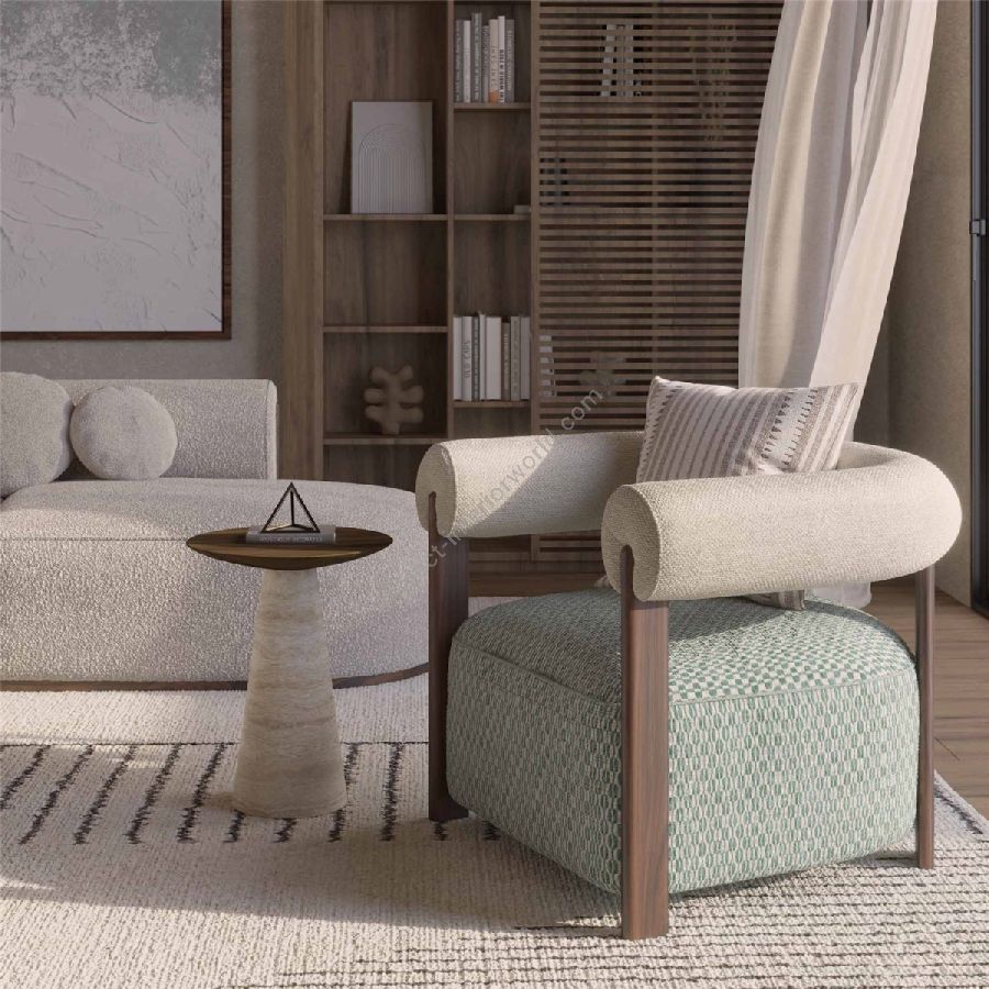 Supported by sturdy walnut legs, the Claire Armchair boasts both stability and a natural aesthetic. The rich, dark wood complements the neutral tones of the upholstery, enhancing the chair’s overall elegance. The open design and curved lines of the armchair provide a contemporary touch, making it a perfect fit for modern interiors.