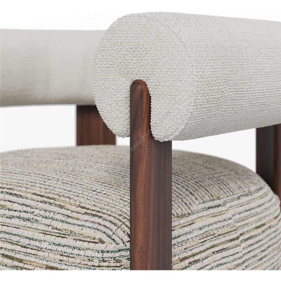 The Claire Armchair features a unique design with a rounded, cushioned backrest and armrests upholstered in a soft, neutral fabric. The chair’s seat is covered in a textured, patterned fabric that adds visual interest and a subtle contrast to the smooth upholstery of the backrest. The combination of these fabrics creates a harmonious and sophisticated look.