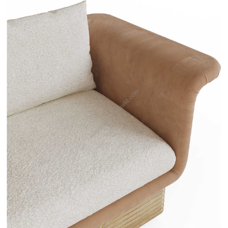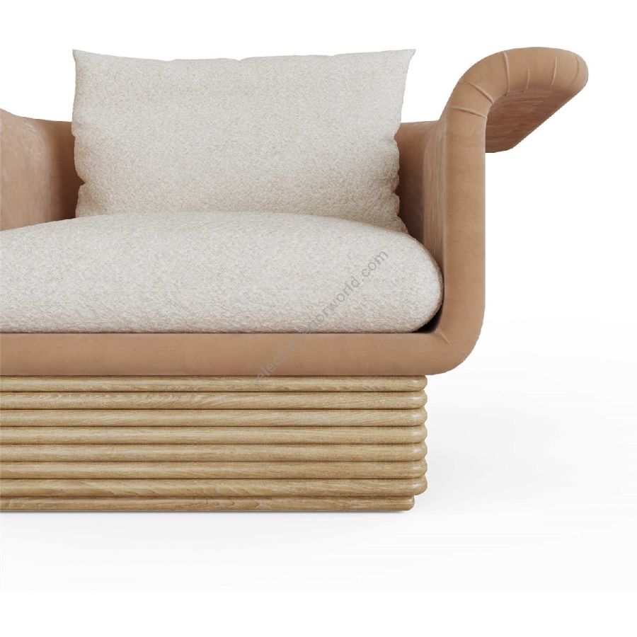 The armchair’s plush seat cushion and backrest pillow are wrapped in soft boucle fabric, providing a cozy and inviting seating experience. The elegant velvet upholstery on the armrests and sides adds a touch of sophistication and tactile delight. The sturdy oak base, with its distinctive layered design, ensures stability while adding a natural, stylish flair. Whether placed in a living room, bedroom, or stylish office, the Isabella armchair enhances your decor with its refined charm and comfortable design.
