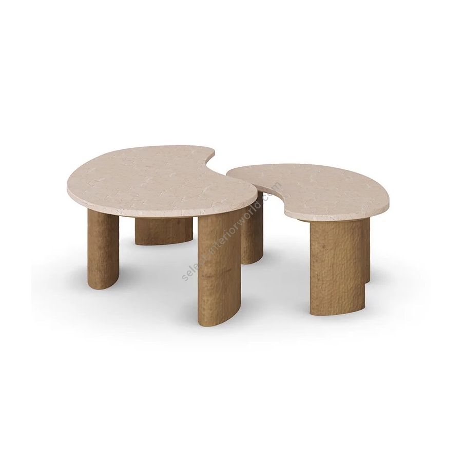 Supporting the marble top is a base made from carved oak, finished with a warm varnish that highlights the wood’s natural grain and texture. The oak base is designed with a sculptural, asymmetrical form that adds visual interest and complements the organic shape of the marble top. The combination of marble and oak creates a balanced contrast between sleek and rustic elements, making the Amara Coffee Table a versatile addition to both contemporary and traditional settings.