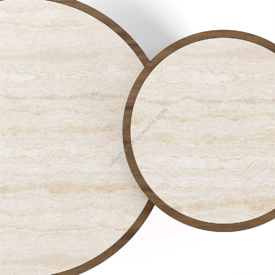 Nolita Harbour Liz Coffee Table Set, a sophisticated blend of natural materials and modern design. This exquisite set features two coffee tables with luxurious travertine tops and sleek walnut matte bases, offering both functionality and aesthetic appeal. The modular design allows for versatile arrangement options, making it perfect for various living spaces.