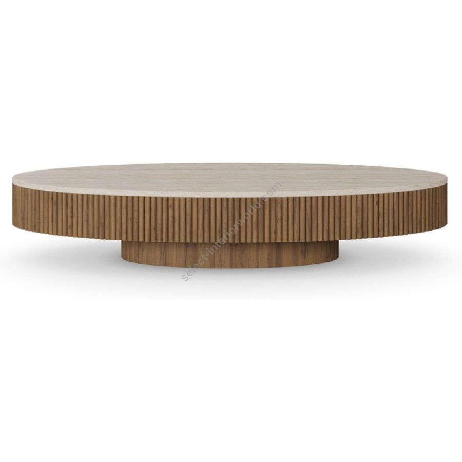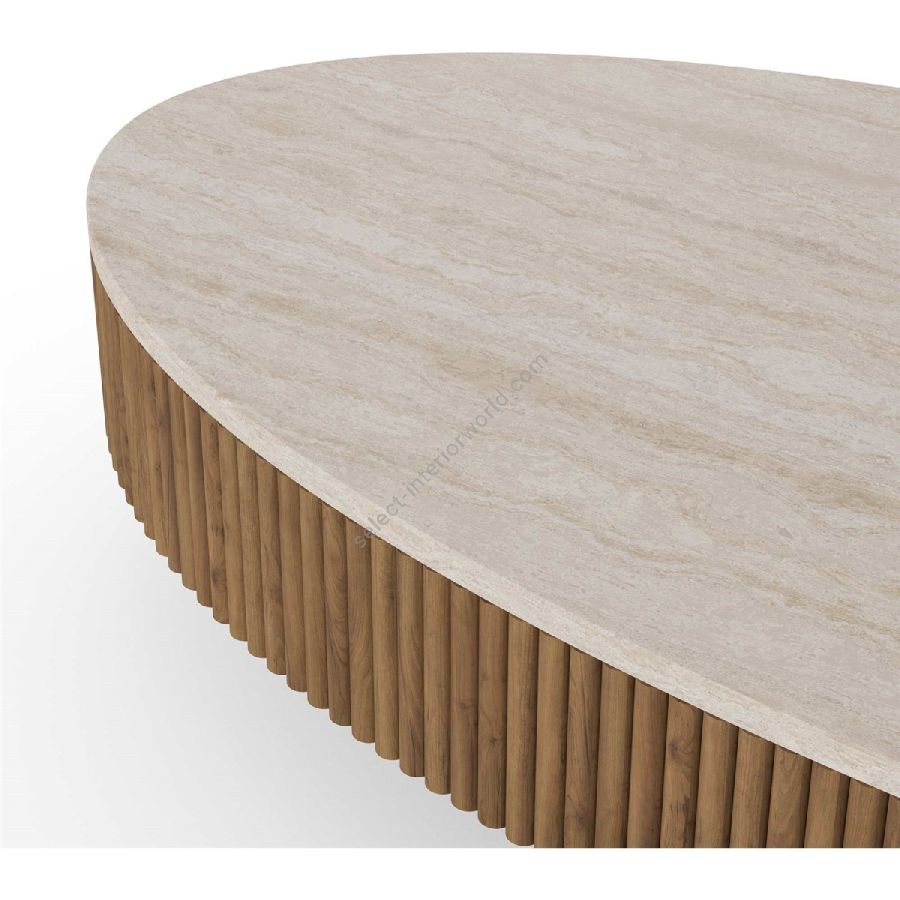 The base of the table is constructed from ribbed walnut, adding a distinctive texture and visual interest to the piece. The ribbed detailing around the base contrasts elegantly with the smooth travertine top, creating a harmonious balance of materials. The warm tones of the walnut further complement the natural stone, making this coffee table a versatile addition to both modern and traditional interiors.