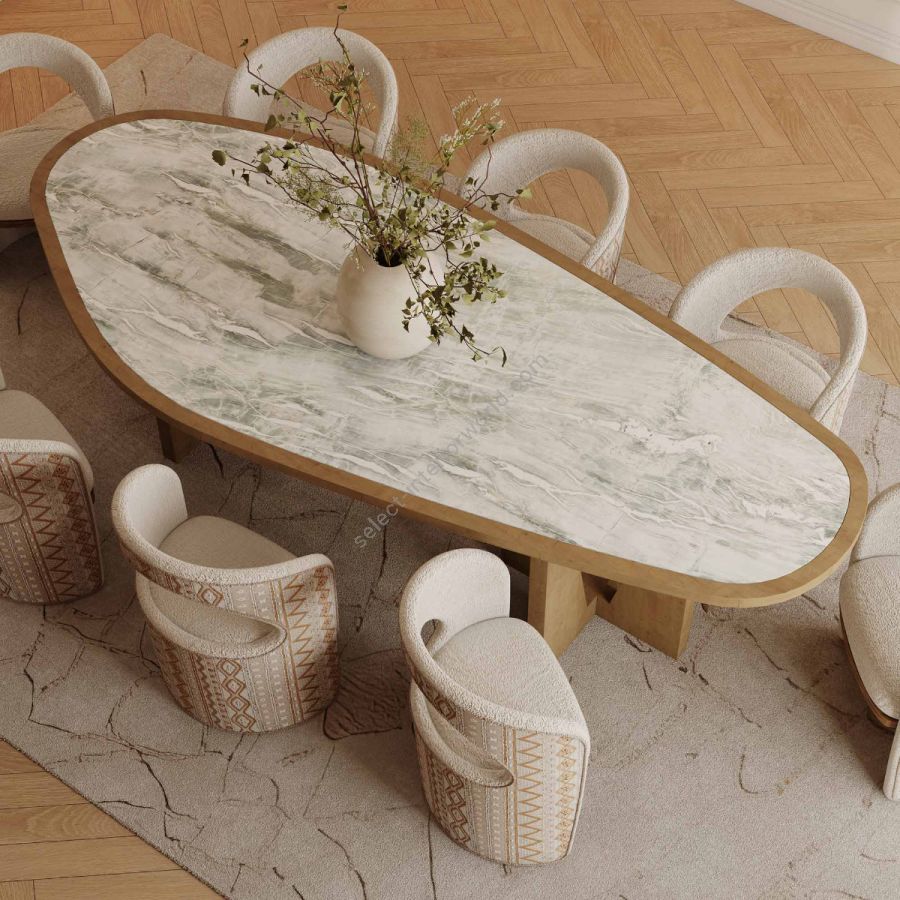 The Alba Dining Table by Nolita Harbour is an exquisite blend of natural materials and contemporary design, offering a perfect balance of form and function. This table is designed to elevate any dining space with its unique silhouette and high-quality craftsmanship, making it a centerpiece of modern elegance. The tabletop of the Alba Dining Table is crafted from premium travertine, a natural stone known for its distinctive texture and warm, earthy tones. The travertine surface is finely honed to provide a smooth, luxurious finish that highlights the stone’s natural beauty and subtle veining. The organic shape of the tabletop adds a modern twist, giving the table a soft, fluid aesthetic that contrasts beautifully with the strong, geometric lines of its base.