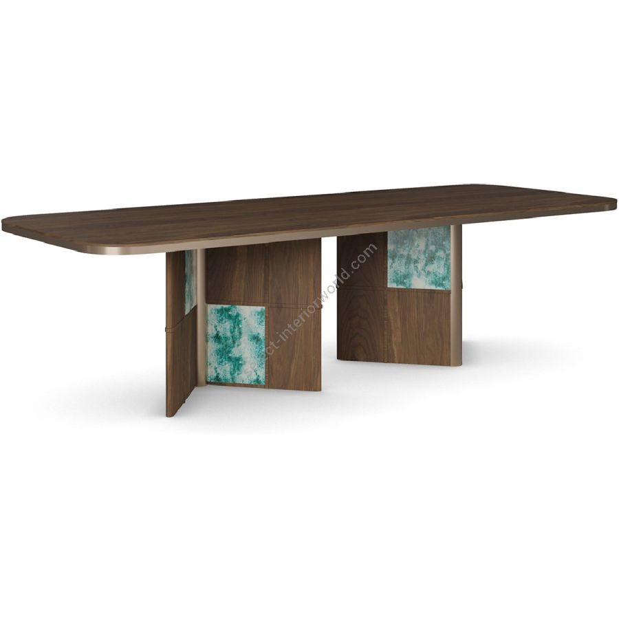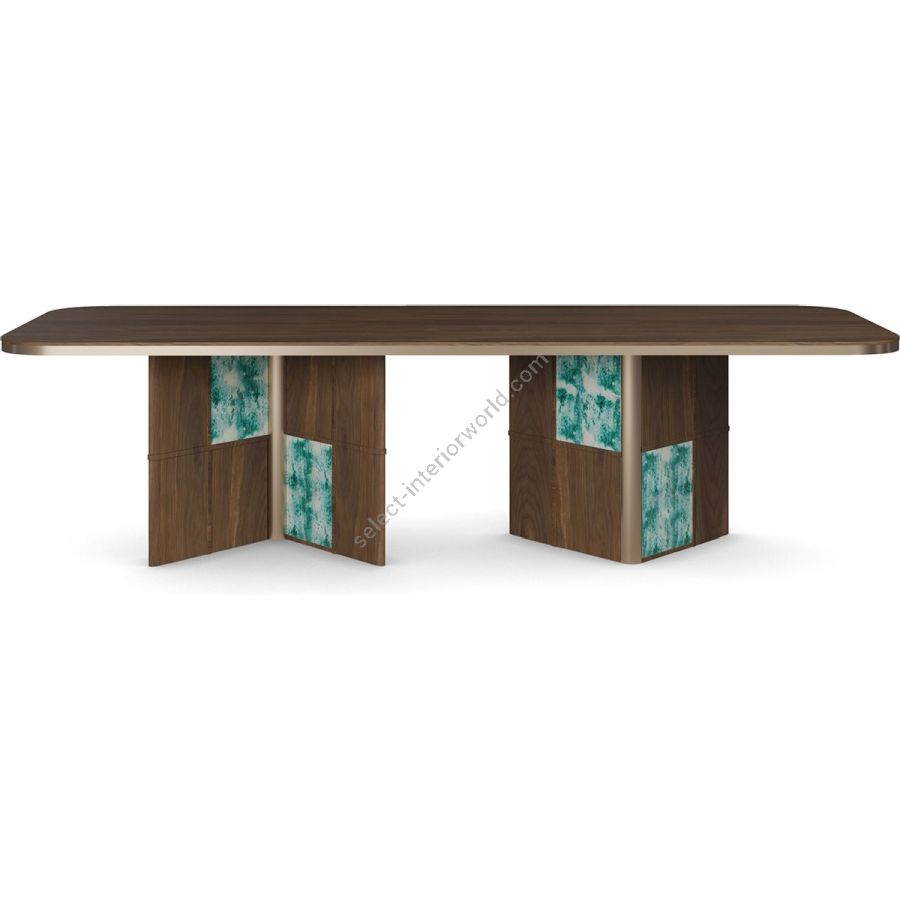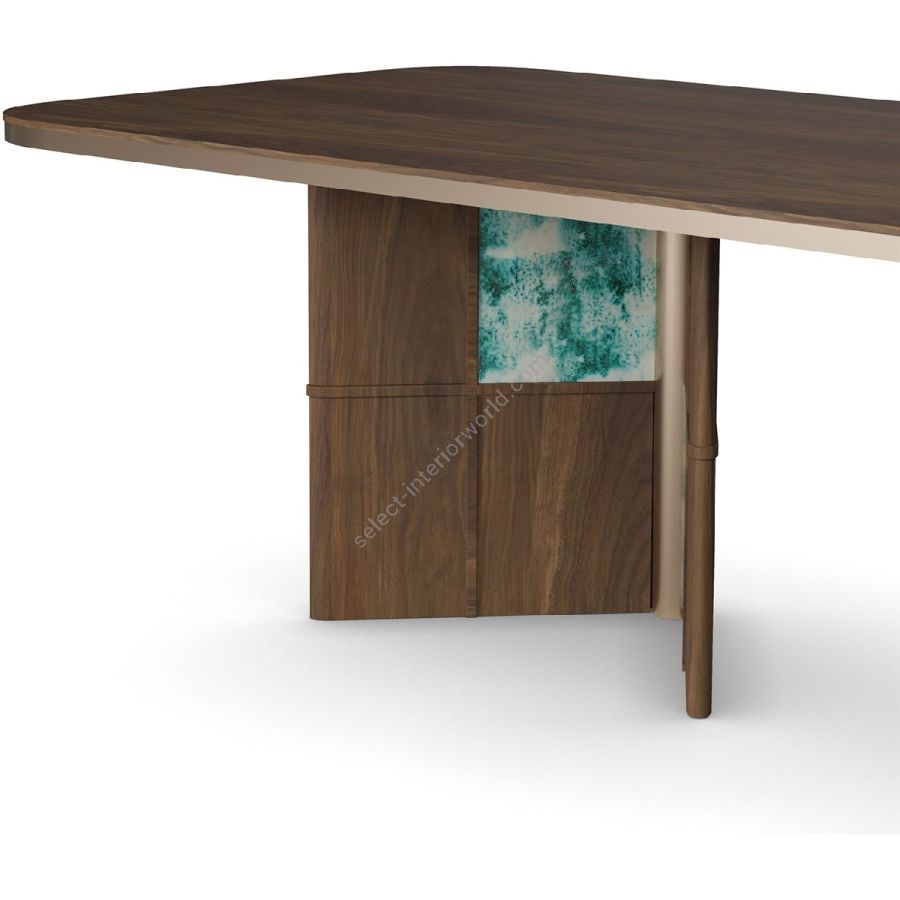 Axelle Dining Table from Nolita Harbour is a masterpiece of modern craftsmanship, seamlessly blending luxurious materials, sculptural design, and artisanal detailing. At its core, the table features a sleek walnut tabletop with smooth, curved edges, exuding warmth and sophistication. The standout feature lies in its sculptural legs, adorned with striking green ceramic tiles that create a bold contrast against the rich walnut, adding depth and visual intrigue.