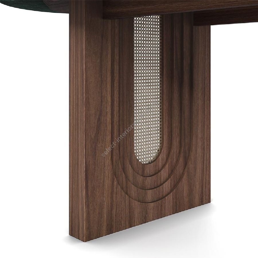 Supporting the elegant marble top is a robust wooden base with intricate detailing and rattan accents. The base showcases a combination of rich walnut wood and a unique pattern, with rattan inserts adding both stability and artistic flair. This dining table is perfect for hosting lavish dinner parties or enjoying intimate family meals, providing both functionality and a statement of style.