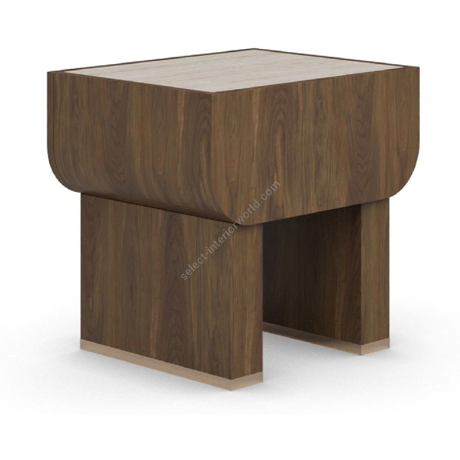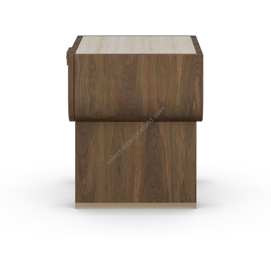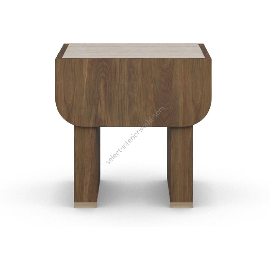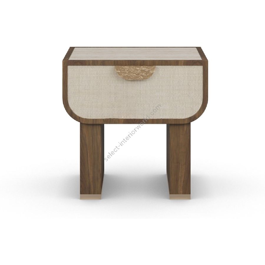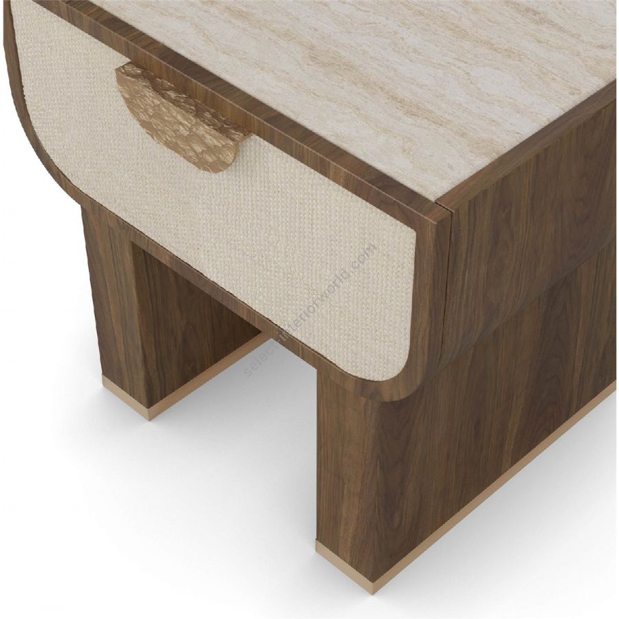 The Rae nightstand is a refined fusion of natural textures and modern craftsmanship. Framed in rich walnut, this piece exudes warmth and sophistication. Its generously sized drawer, featuring a textured front, offers both storage and visual depth. The luxurious travertine top introduces an organic contrast, enhancing the overall elegance of the design. A standout feature is its hammered brass handle, adding an artisanal touch with its unique texture and refined finish. Elevated by sturdy walnut legs, the Rae nightstand is a timeless addition to contemporary bedrooms, seamlessly blending functionality with artisanal beauty.