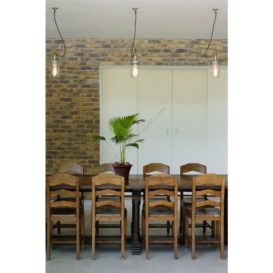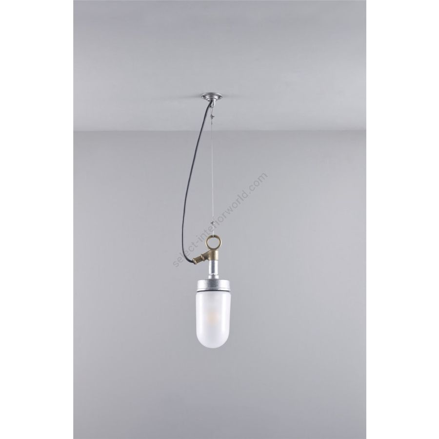 A simple iron pendant with screw type well glass. Galvanised finish with brass suspension loop and cable entry. Suspended using stainless steel wire from a ceiling hook plate.