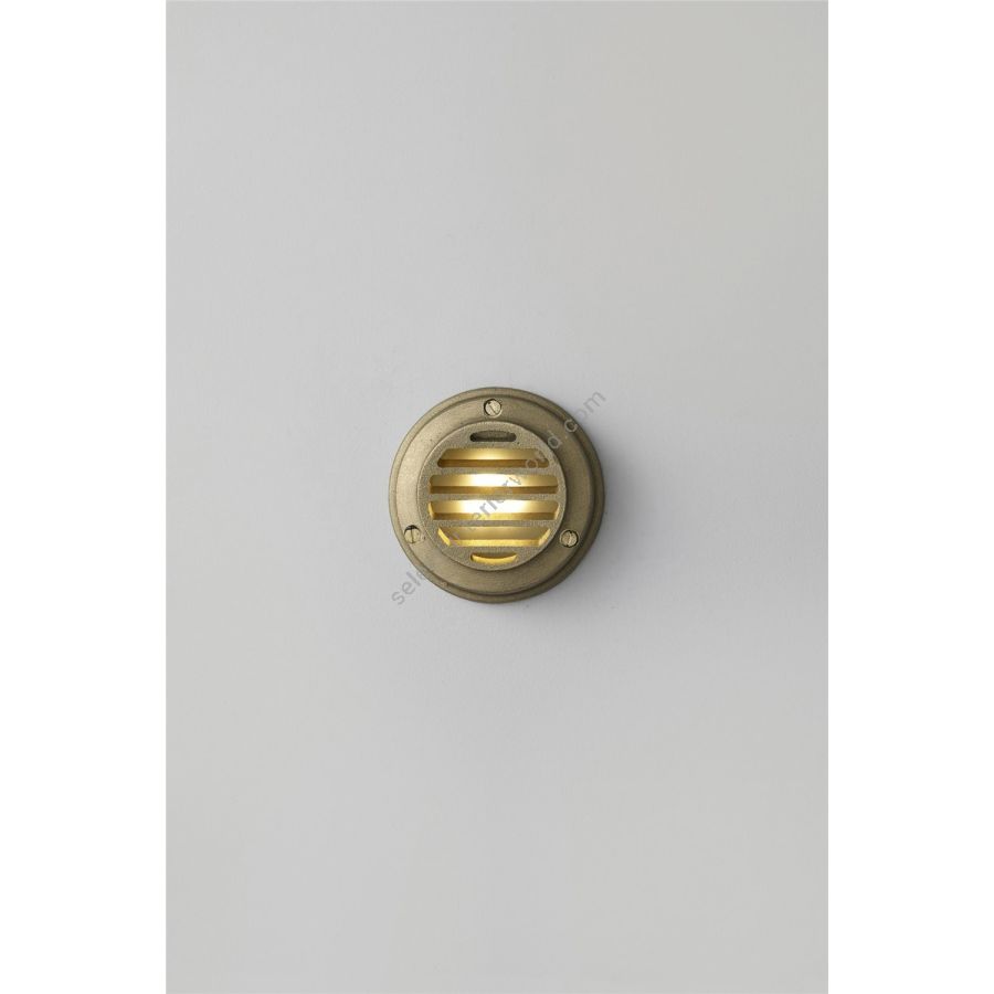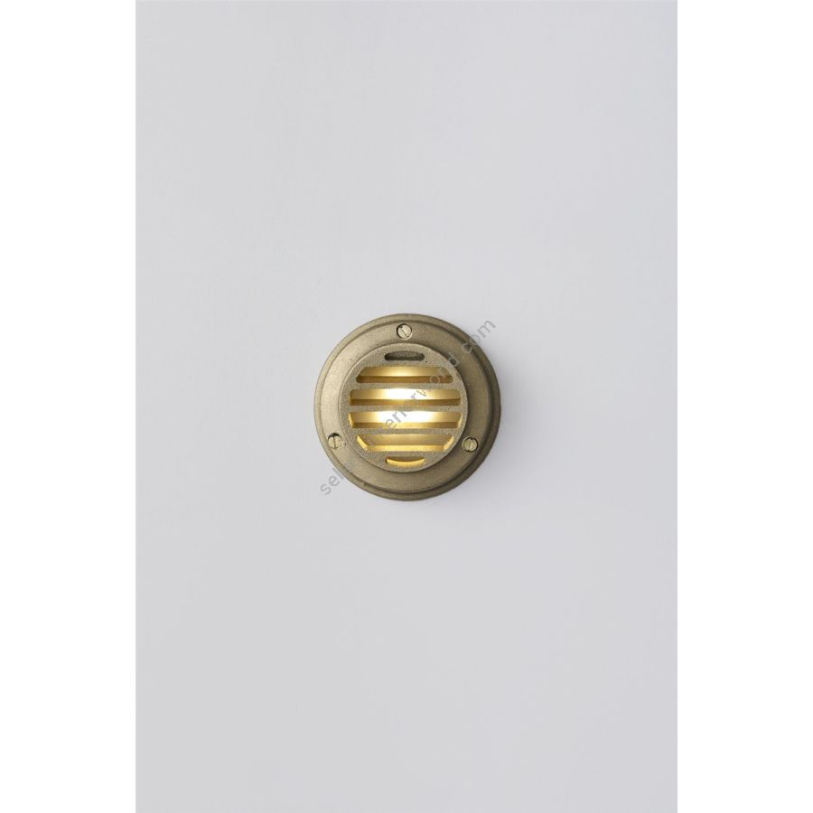 Low Voltage Step or Path Light for surface mounting, available in a sandblasted brass or weathered brass finish. Frosted glass diffuser. This product requires an additional low voltage halogen transformer to connect to a standard mains voltage circuit.