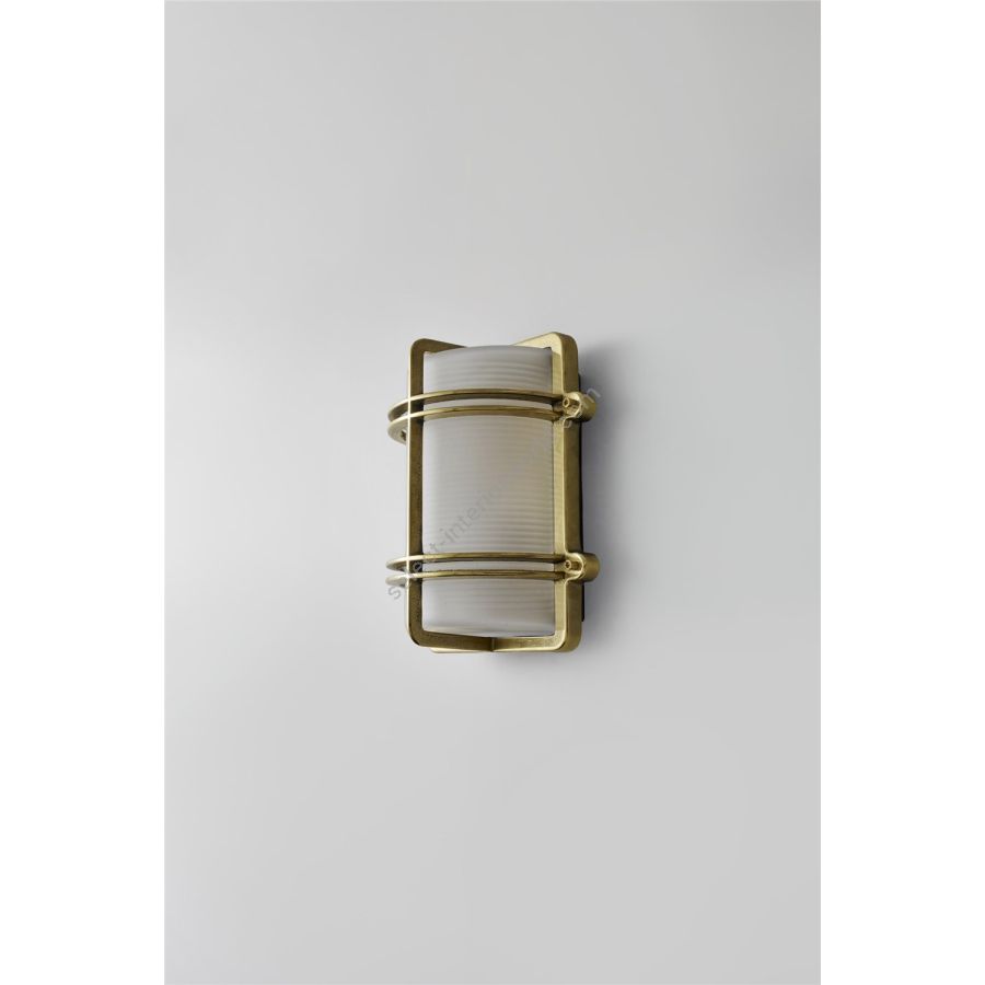 Die-cast rectangular bulkhead light with a curved frosted glass diffuser. Available in natural brass (unlacquered), weathered brass and chrome plated finishes. Front guard secured with socket head screws.