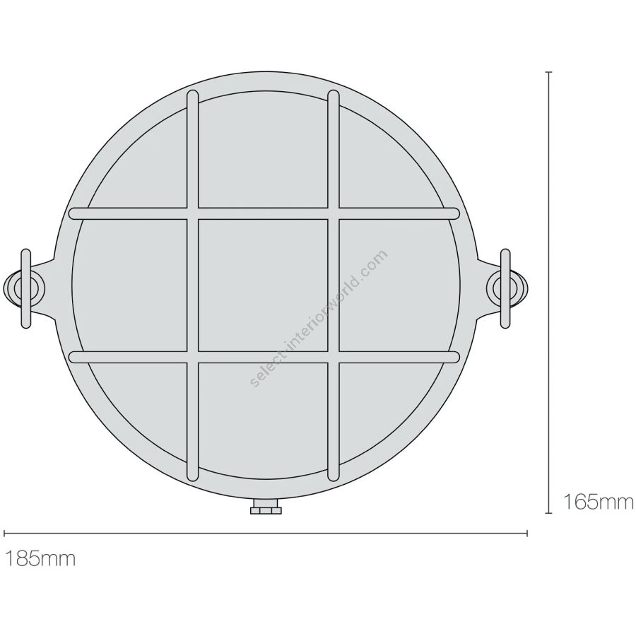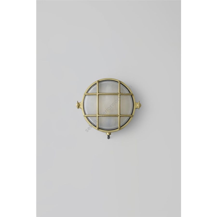 A small die-cast bulkhead light in natural brass (unlacquered) and with frosted glass diffuser. Also available in weathered brass and a chrome plated finish. Front guard secured by two wing nuts, dome nuts optional by request. Glanded surface cable entry.