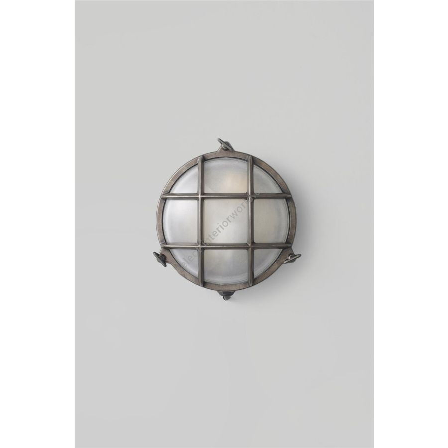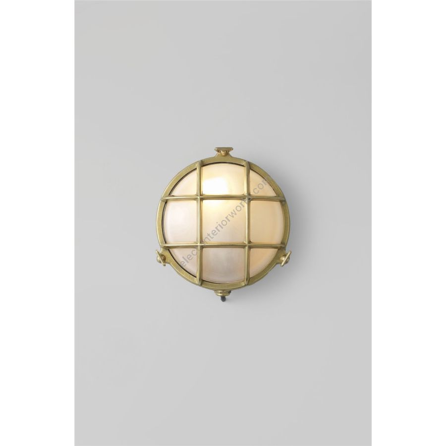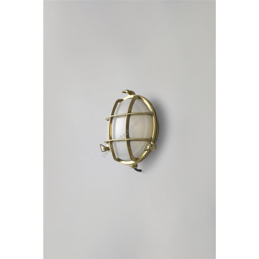 A die-cast bulkhead light in natural brass (unlacquered) with frosted glass diffusers. Also available in weathered brass and a chrome plated finish. Front guard secured by three wing nuts. Glanded surface cable entry.