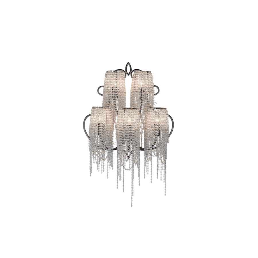 The strings of crystals are exclusively transparent and enriched by irregular elements of different shapes. A coup de theatre of great effect.