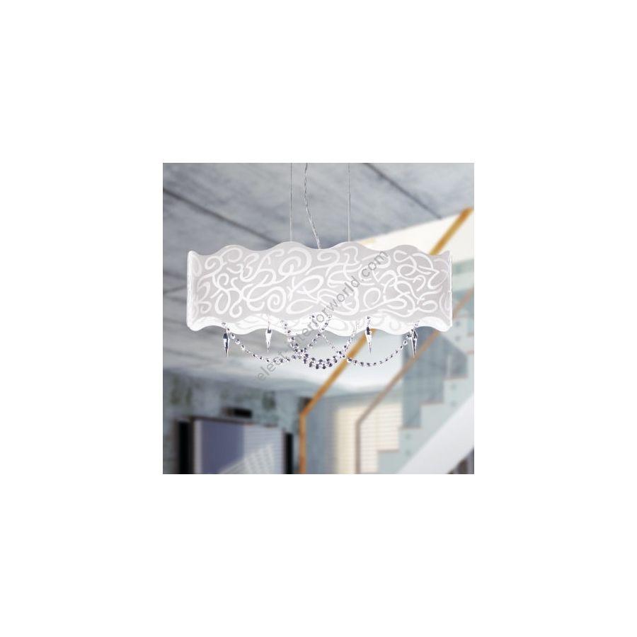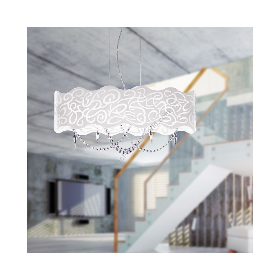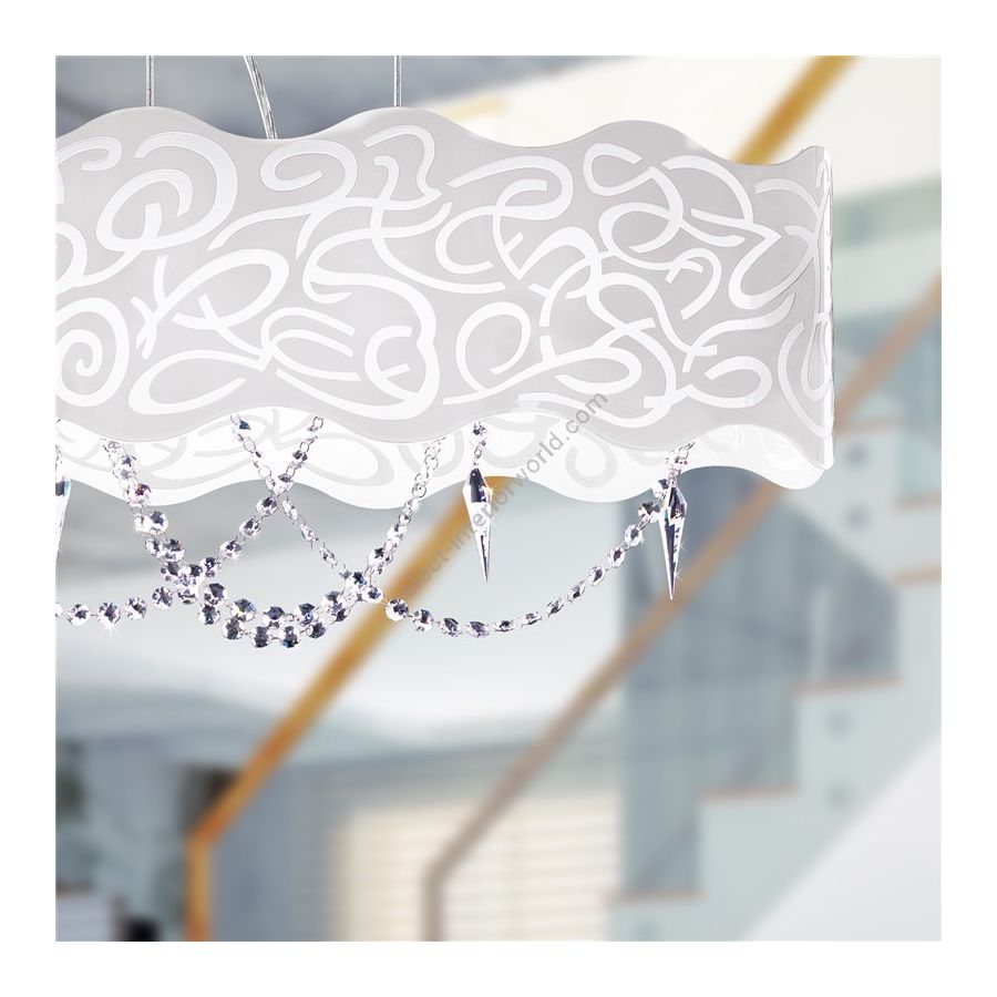 Contemporary curved glass chandelier enriched with swarovski crystal pendants. Ideal for both living and sleeping areas.
