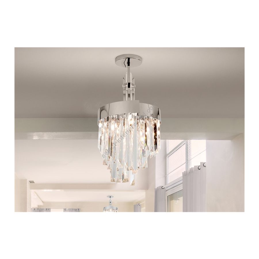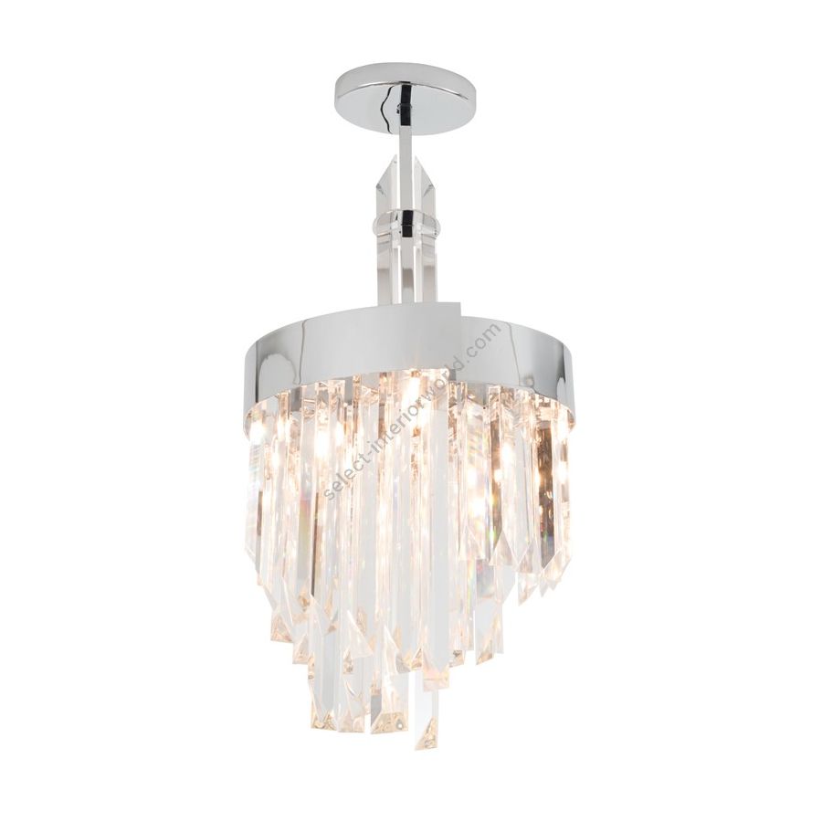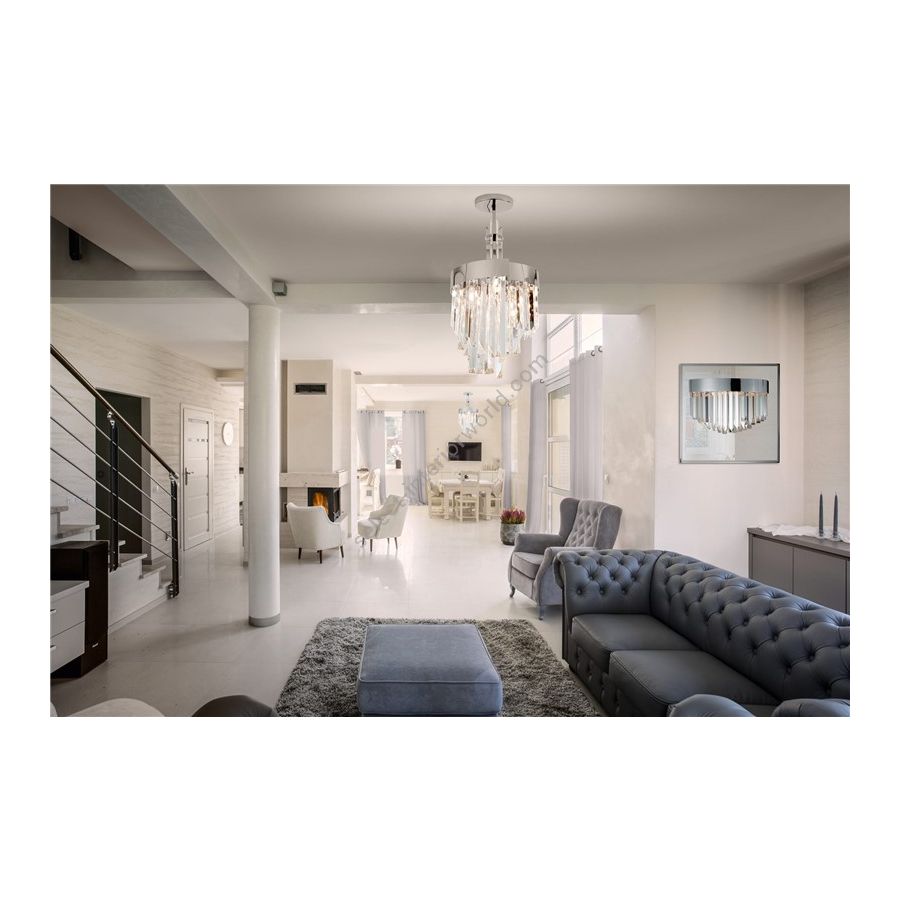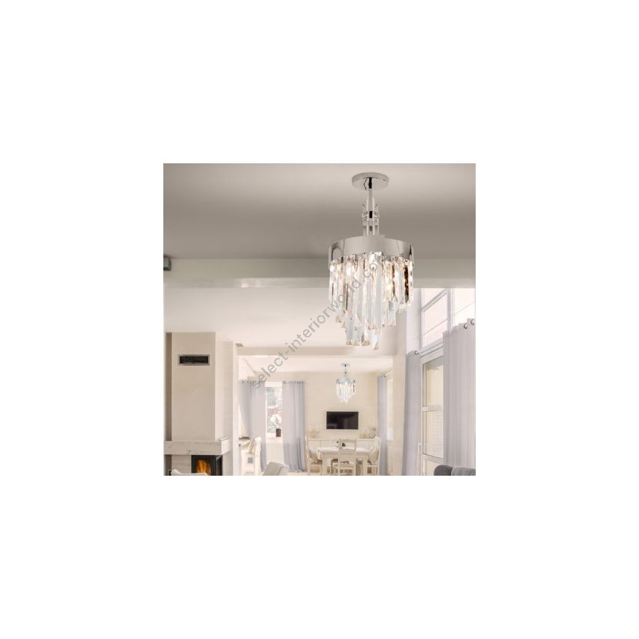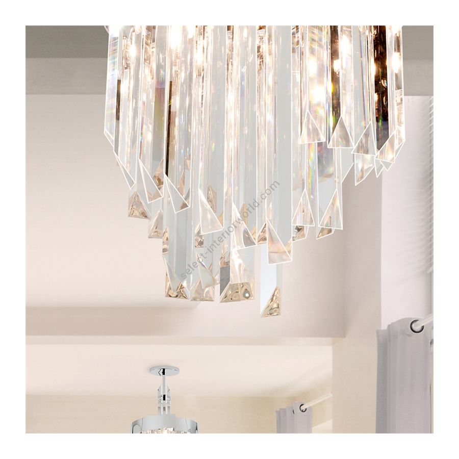Luminous chandelier in clear crystal and aframe in polished chrome frame, dove grey or burnished brass. Elegant and refined chandelier, discover more