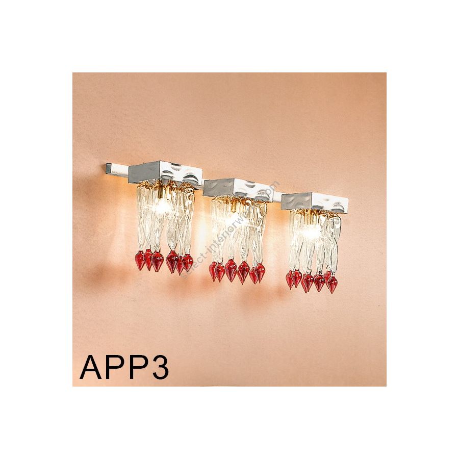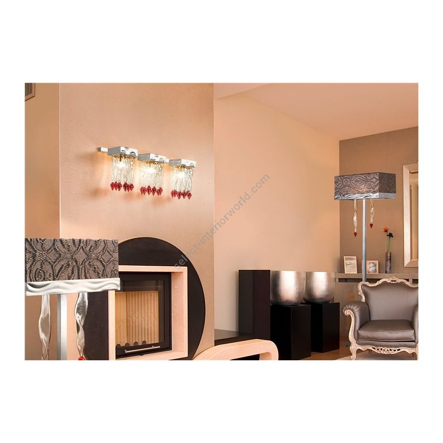 Wall lamp with decorative elements in colourful murano glass and a frame in gold or silver leaf.