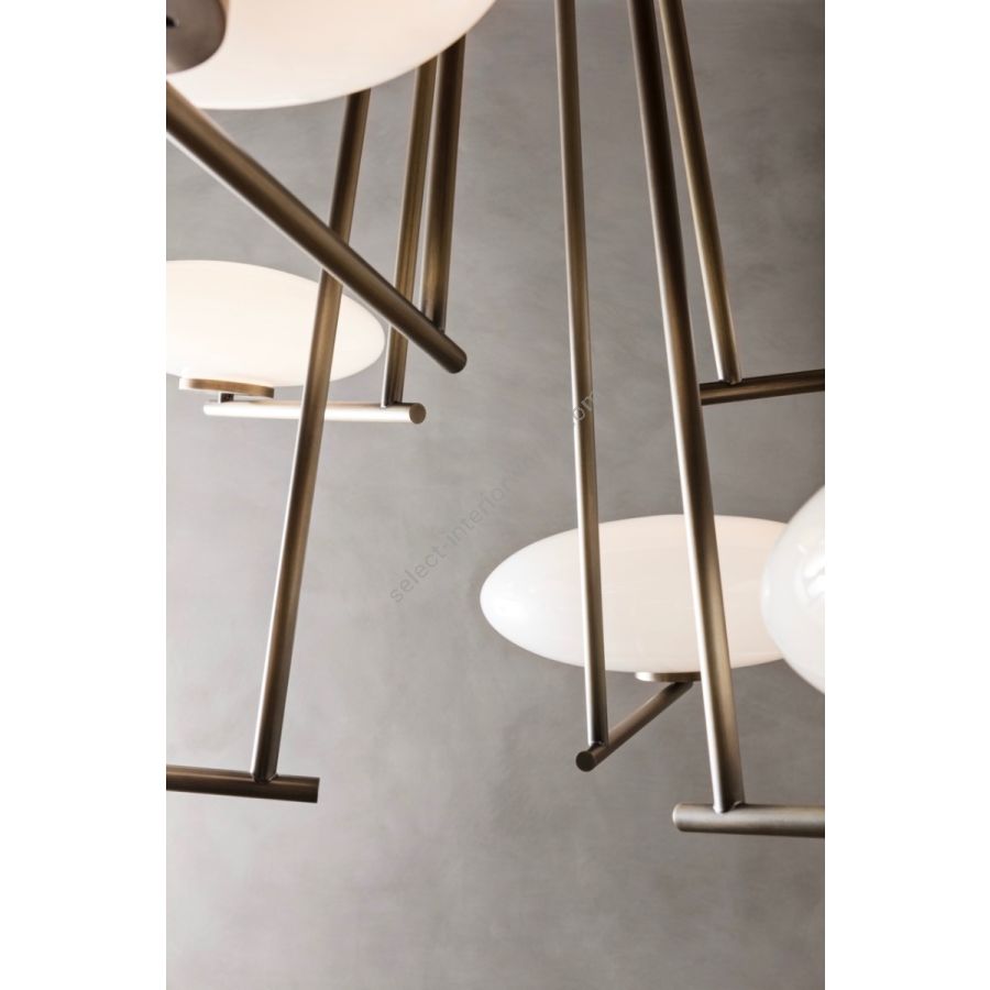 Lamps with structure in matt black varnished metal or brushed bronze. Shade in white blown glass.